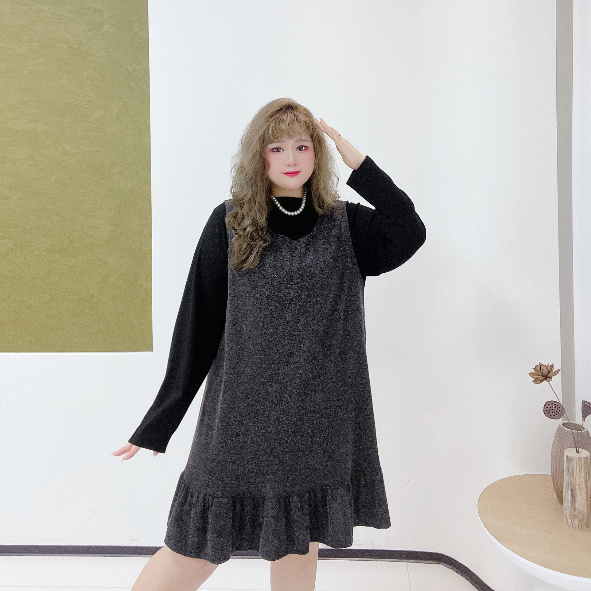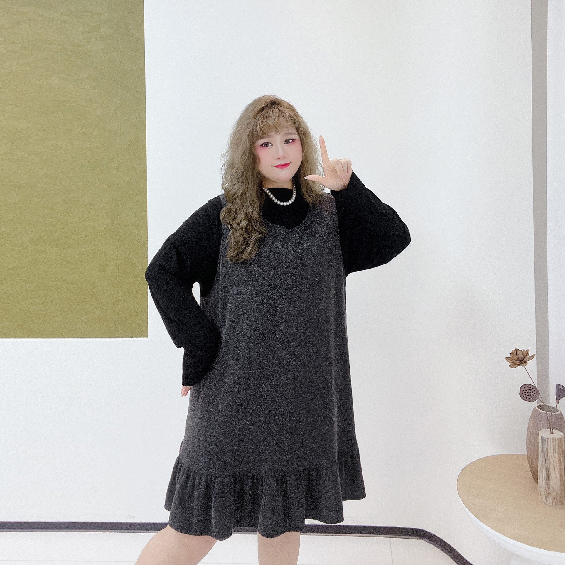 格雷系欧货套装胖莹莹大码女装春季打底衫小个子荷叶边背心连衣裙