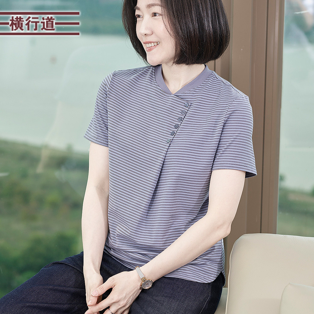 海军风条纹立领斜襟短袖棉T恤打底衫2025夏装新款半袖上衣女装