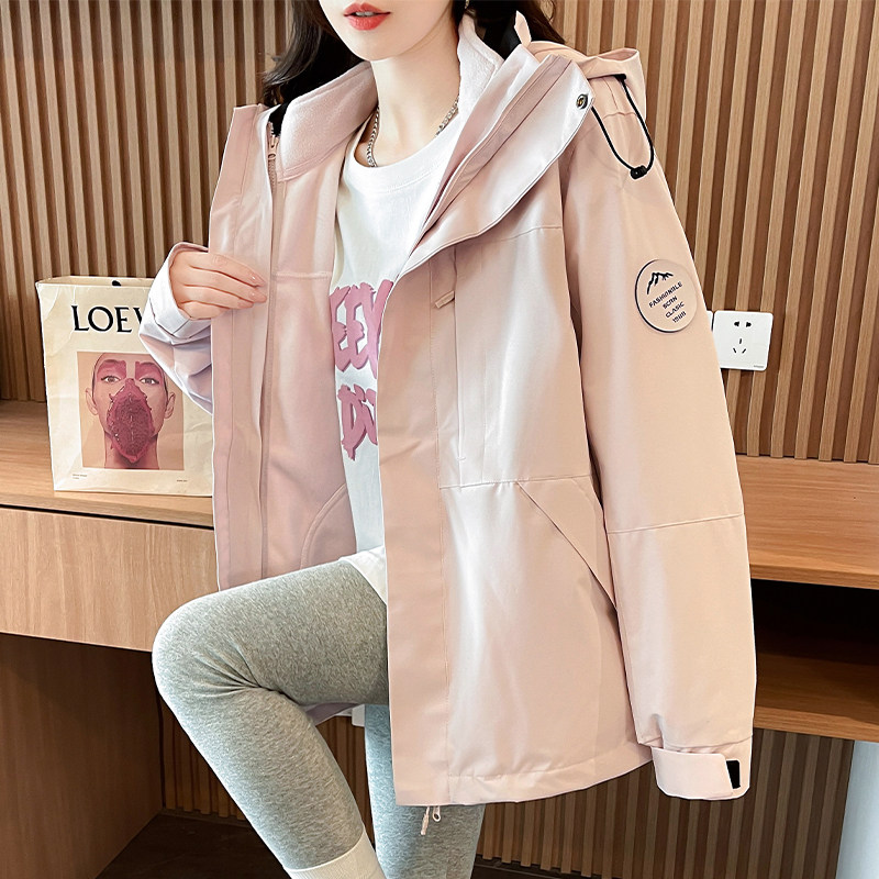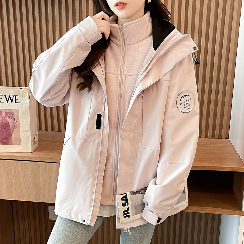 粉色户外冲锋衣外套三合一可拆卸男女同款秋冬加绒加厚连帽登山服