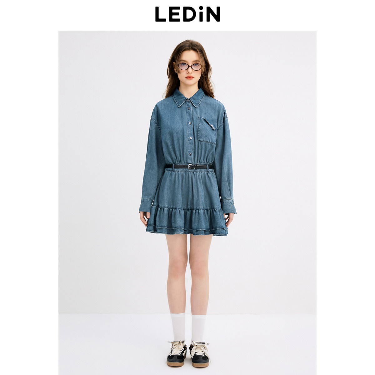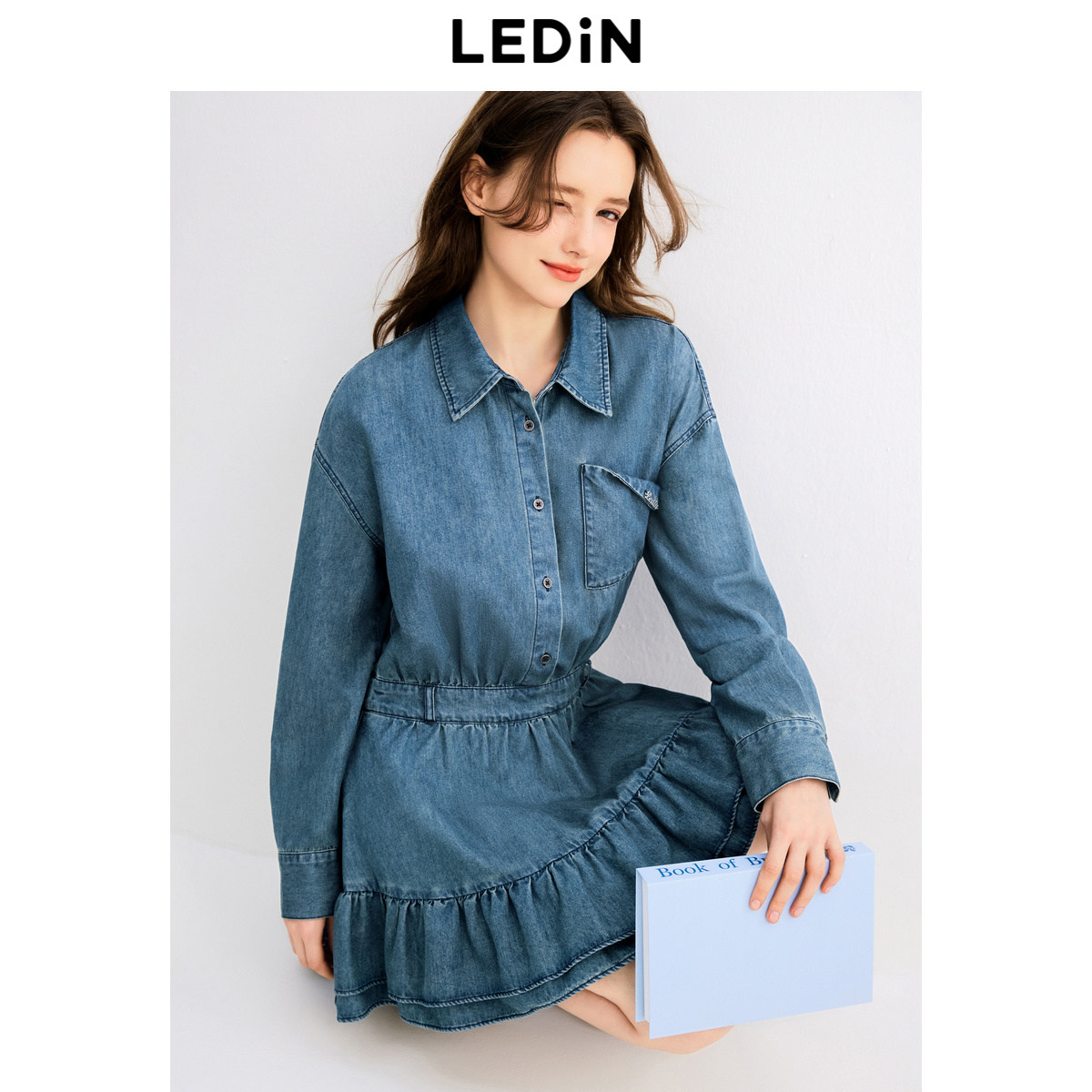 乐町时尚牛仔衬衫裙秋季新款翻领设计甜美蓬蓬裙学院风长袖裙