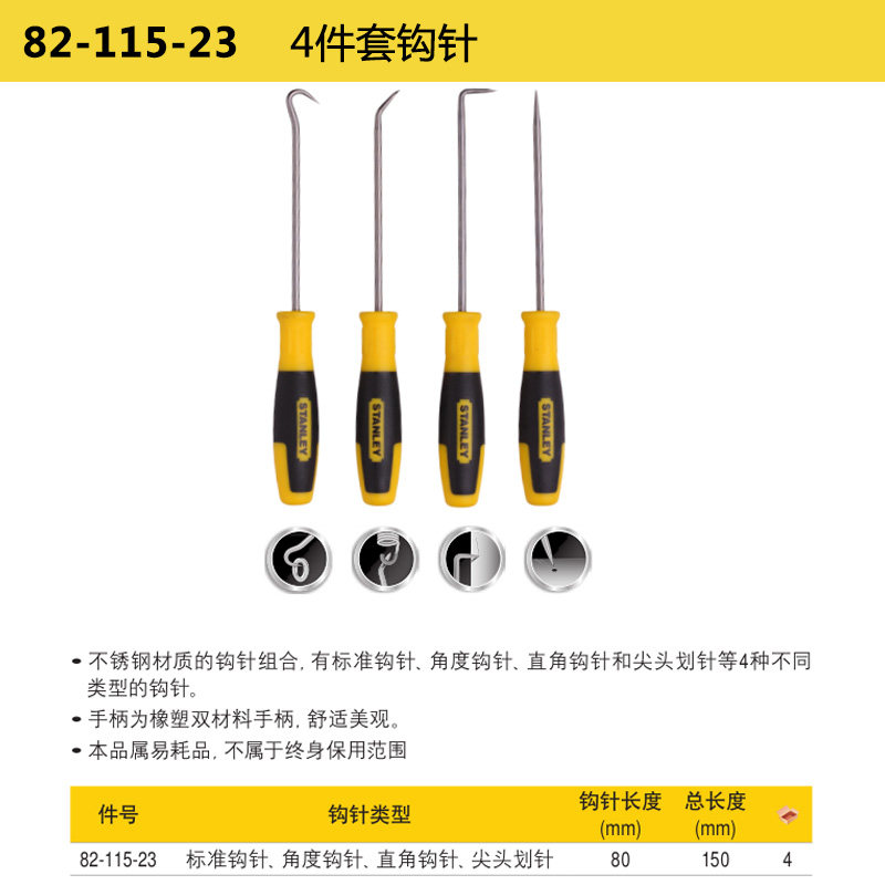 史丹利工具4件套钩针标准角度钩针直角钩针尖头划针82-115-23