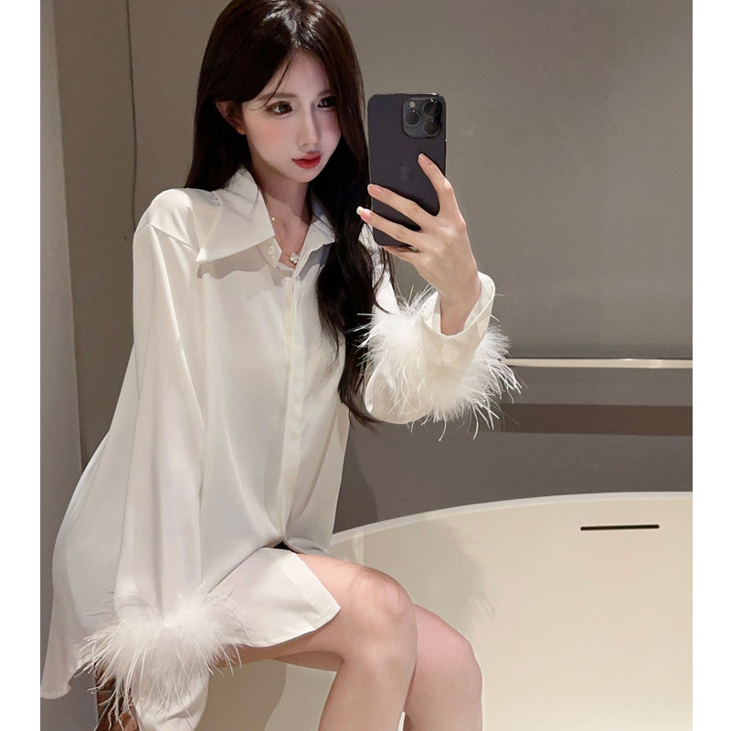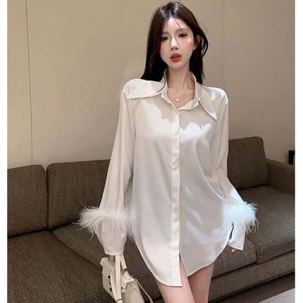 醋酸缎面衬衫女中长款长袖