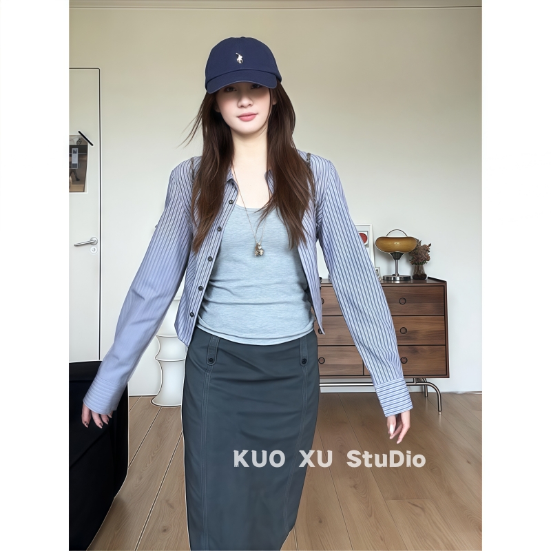 早秋穿搭美式复古夹克外套内搭格子衬衫高腰显瘦工装半身裙套装女