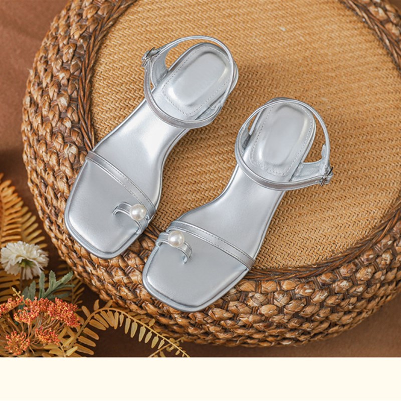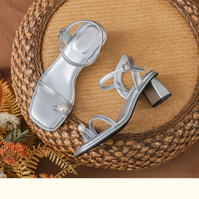 真皮2025年夏新款法式珍珠一字扣带粗跟高跟P夹趾简约凉鞋女高级