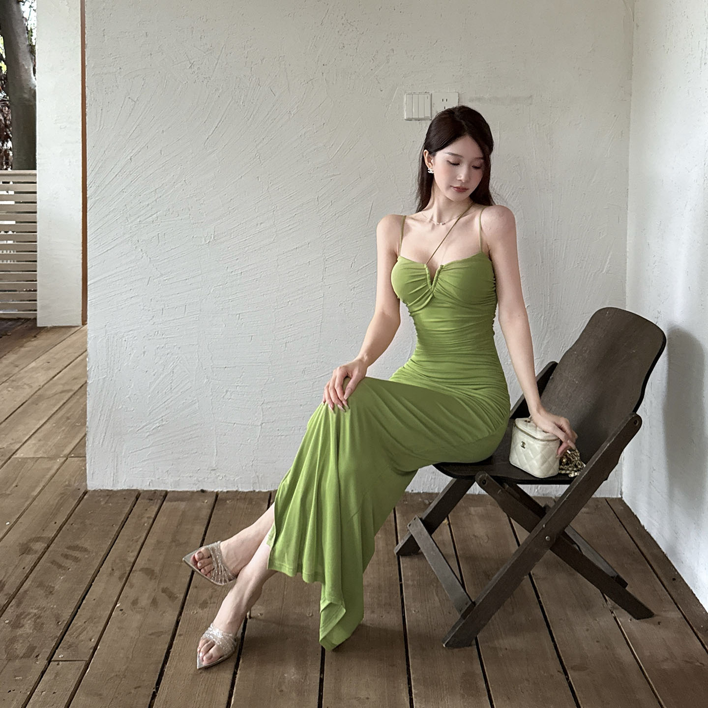 instunning法式纯欲性感褶皱V领吊带连衣裙女夏季新款包臀长裙子