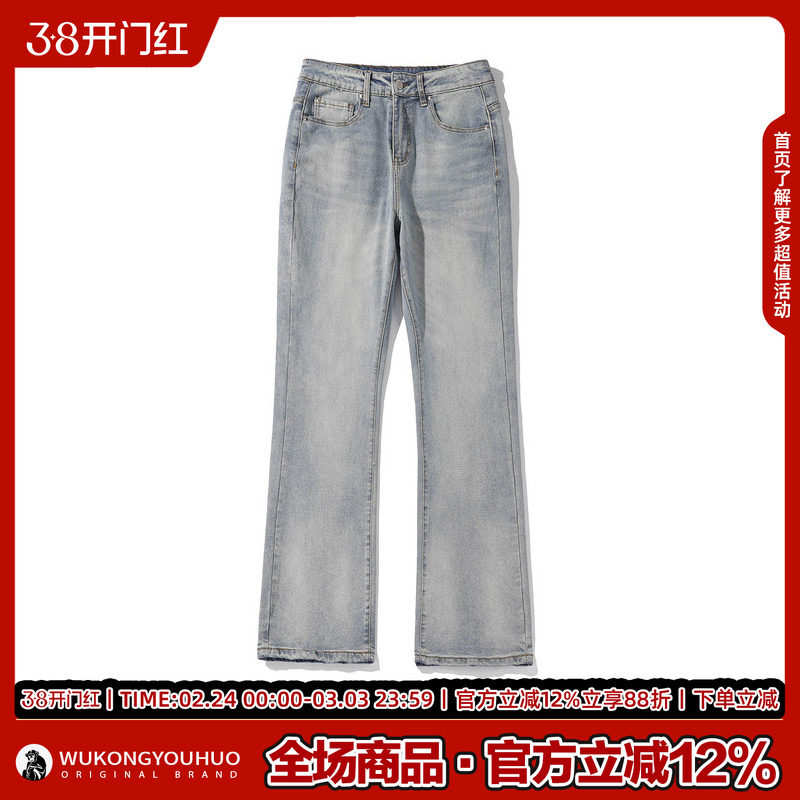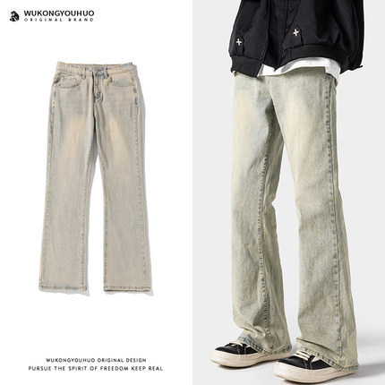 悟空有货复古潮牌美式做旧水洗牛仔裤男街头宽松潮流百搭阔腿长裤