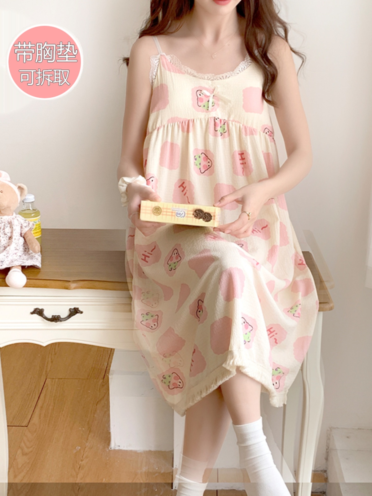 新款睡裙少女夏季甜美ins风吊带带胸垫一体中长睡裙网红家居服