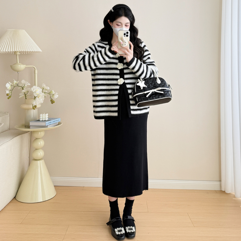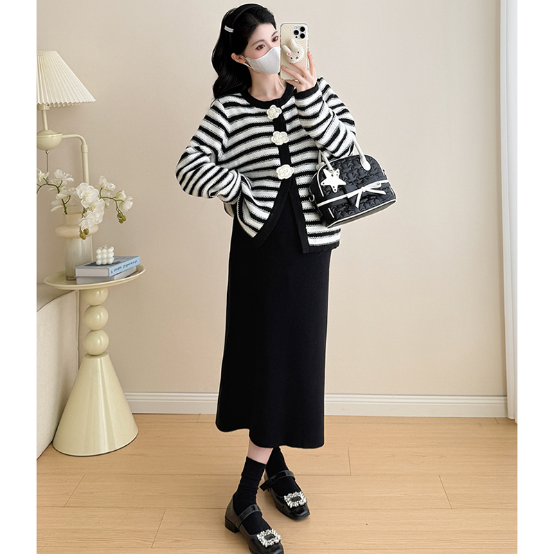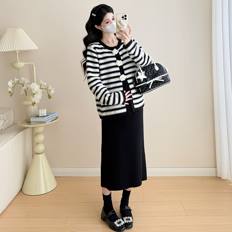 孕妇连衣裙套装春秋冬2025新款韩版潮妈条纹开衫外套半身裙两件套