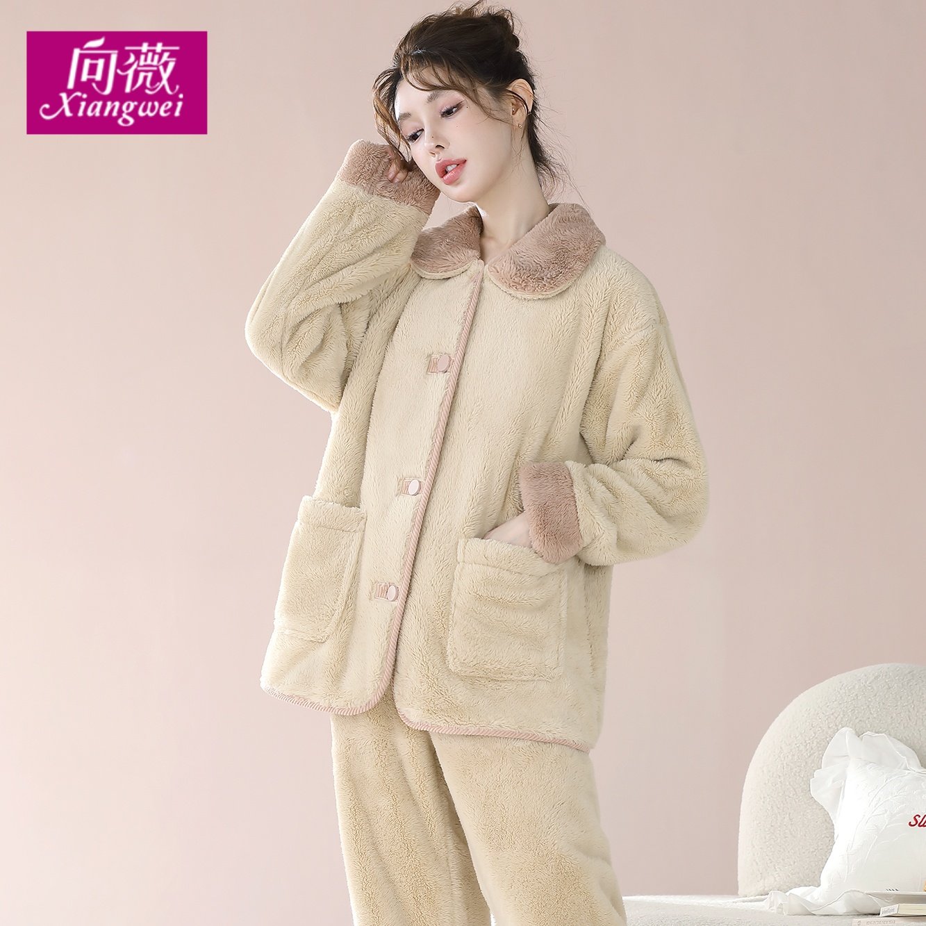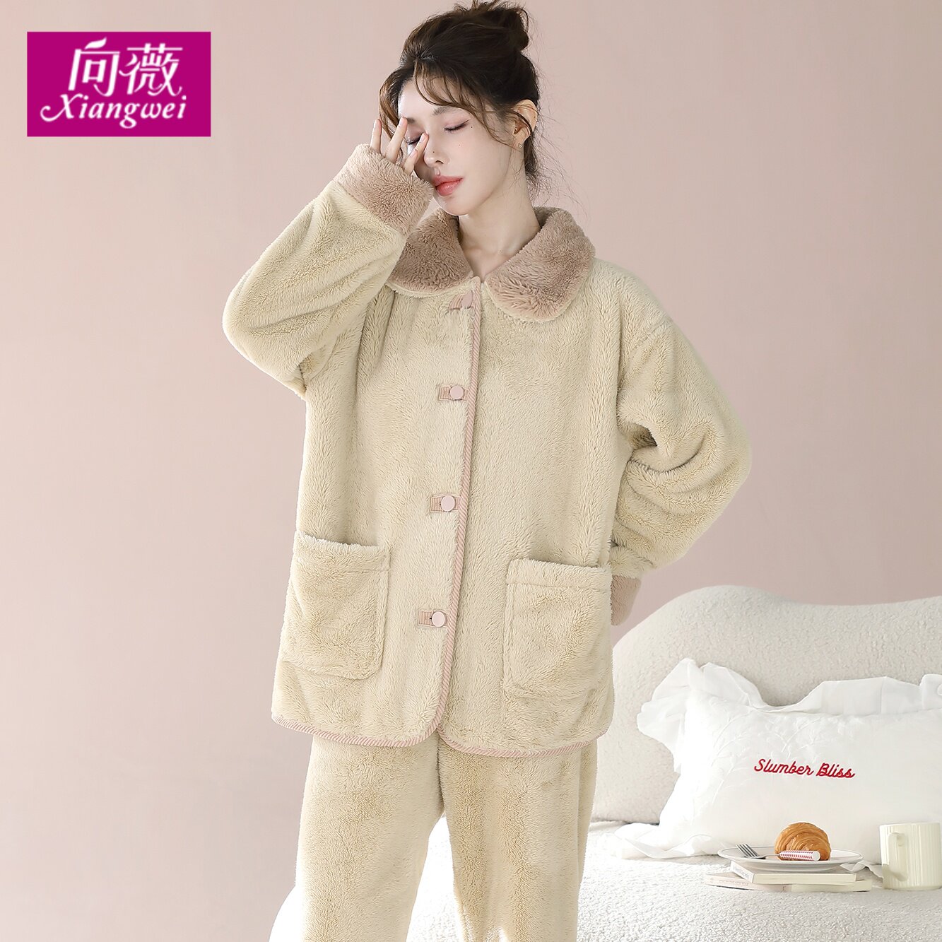 韩版可外穿女士暖绒保暖雪花绒家居服秋冬新款大码宽松法兰绒睡衣