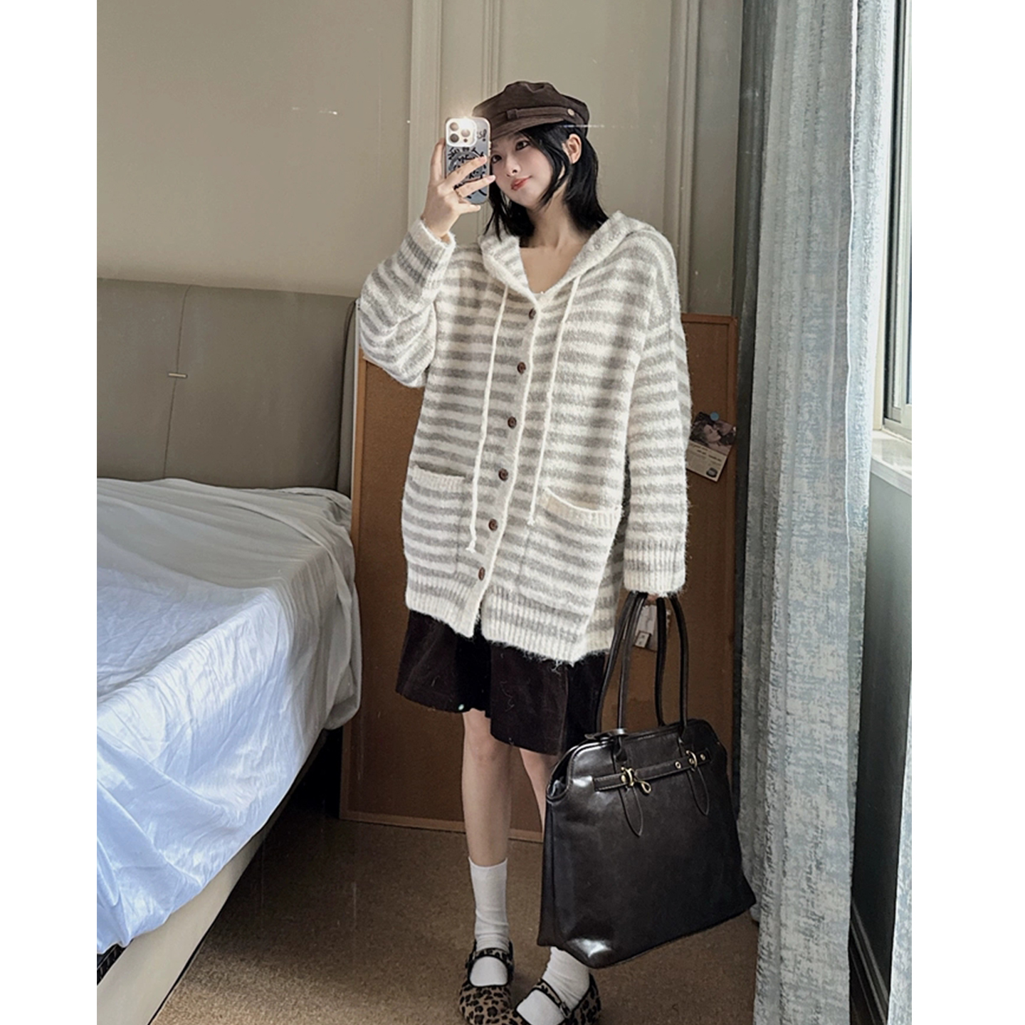 蘑糯糯monoo女装秋冬季连帽条纹羊毛毛衣外套女中长款慵懒风上衣