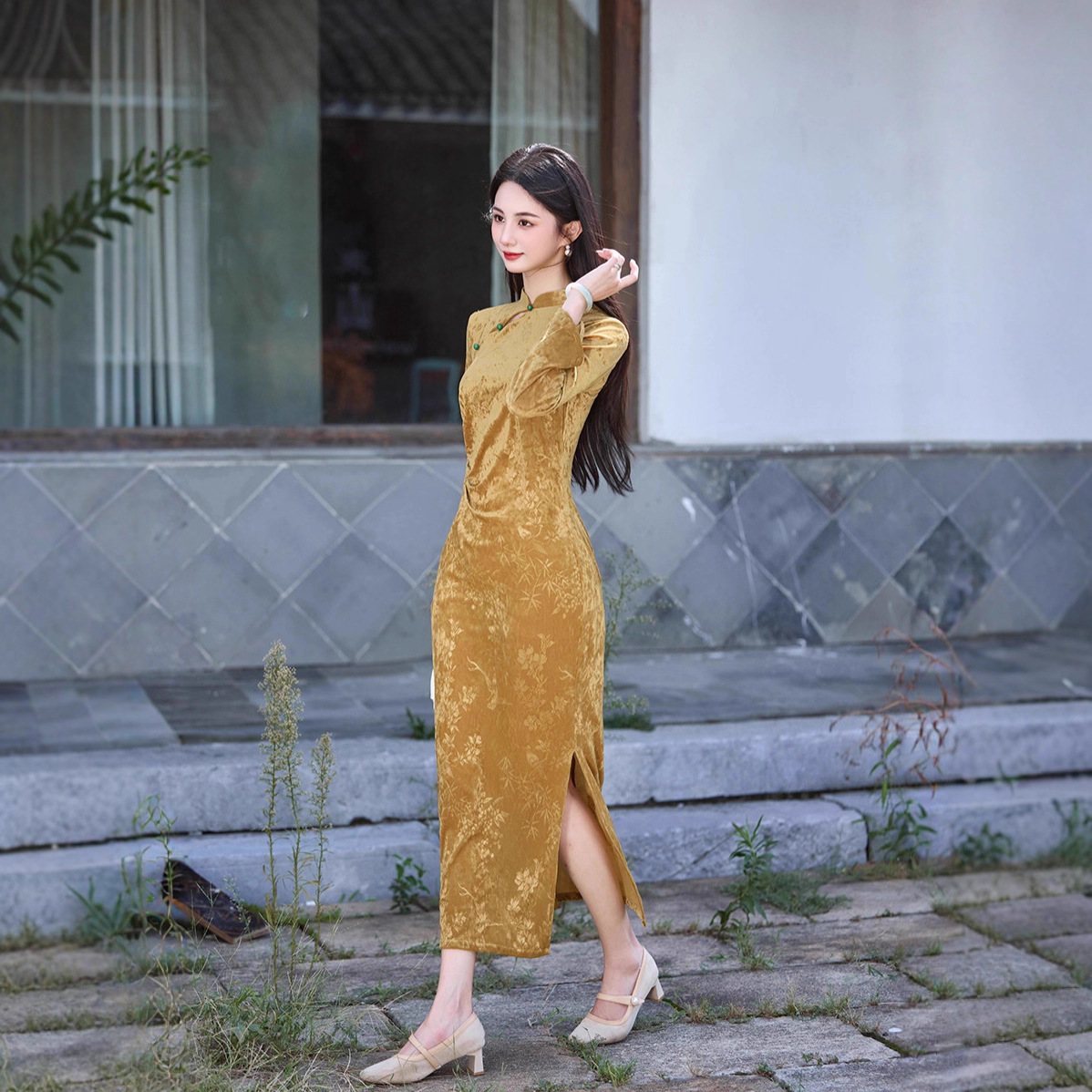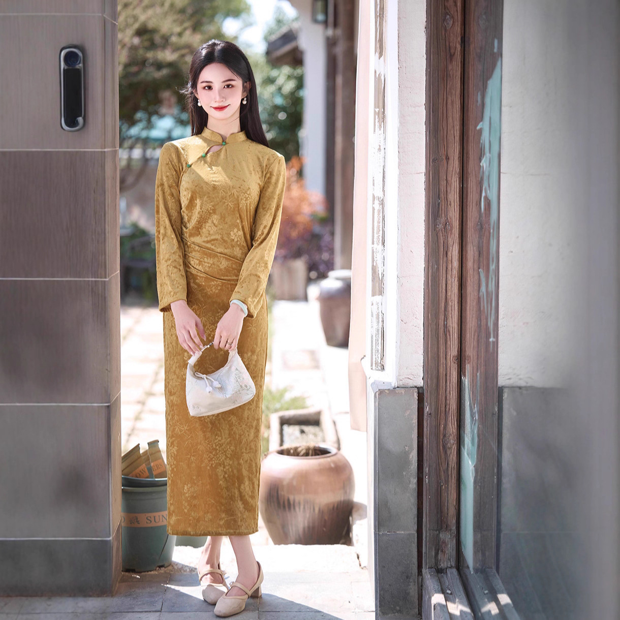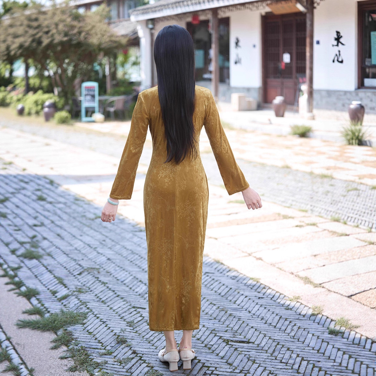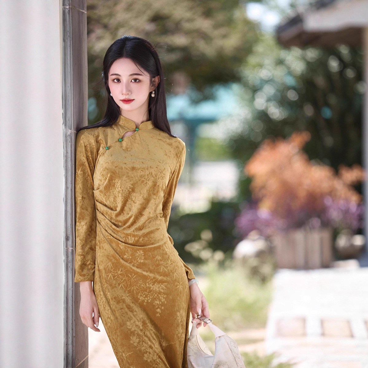 新式旗袍2025秋款中国风优雅气质长款丝绒压花显瘦修身中式连衣裙