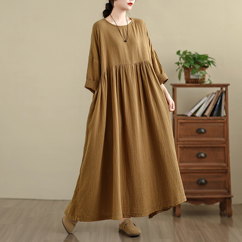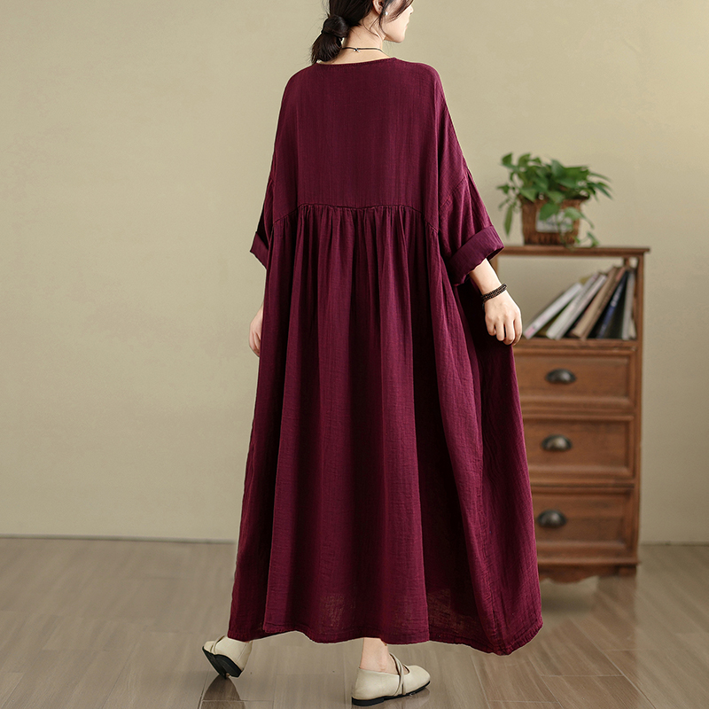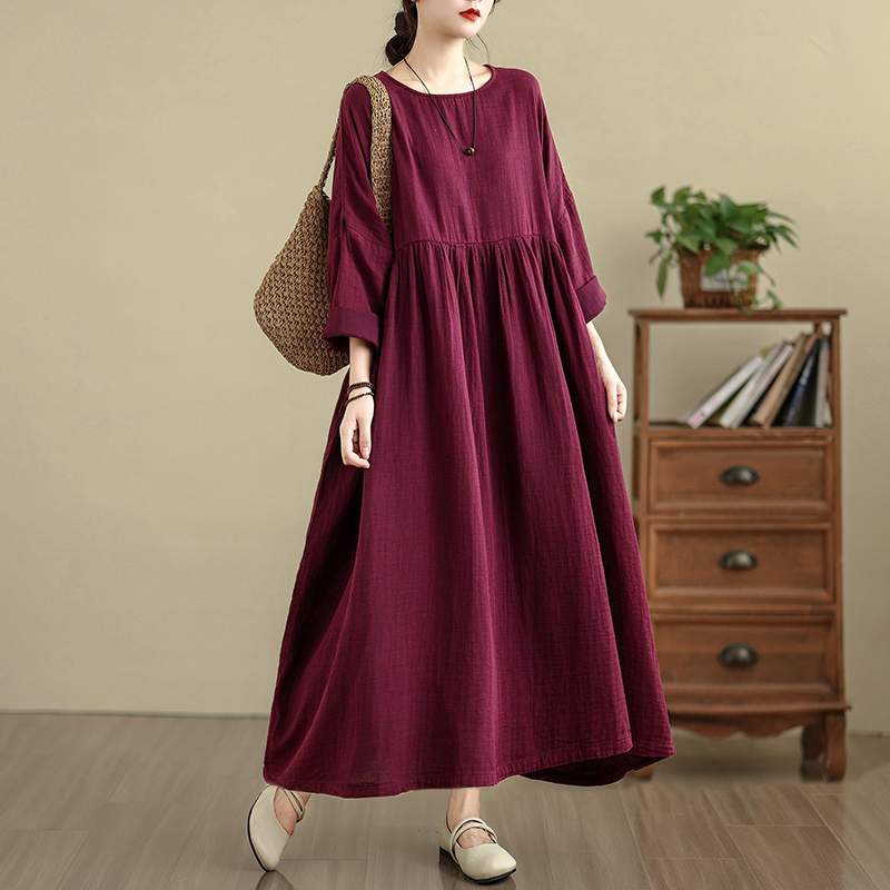 紫红色长袖大码加肥极大复古百搭亲肤棉料加厚长裙棉麻连衣裙纯色