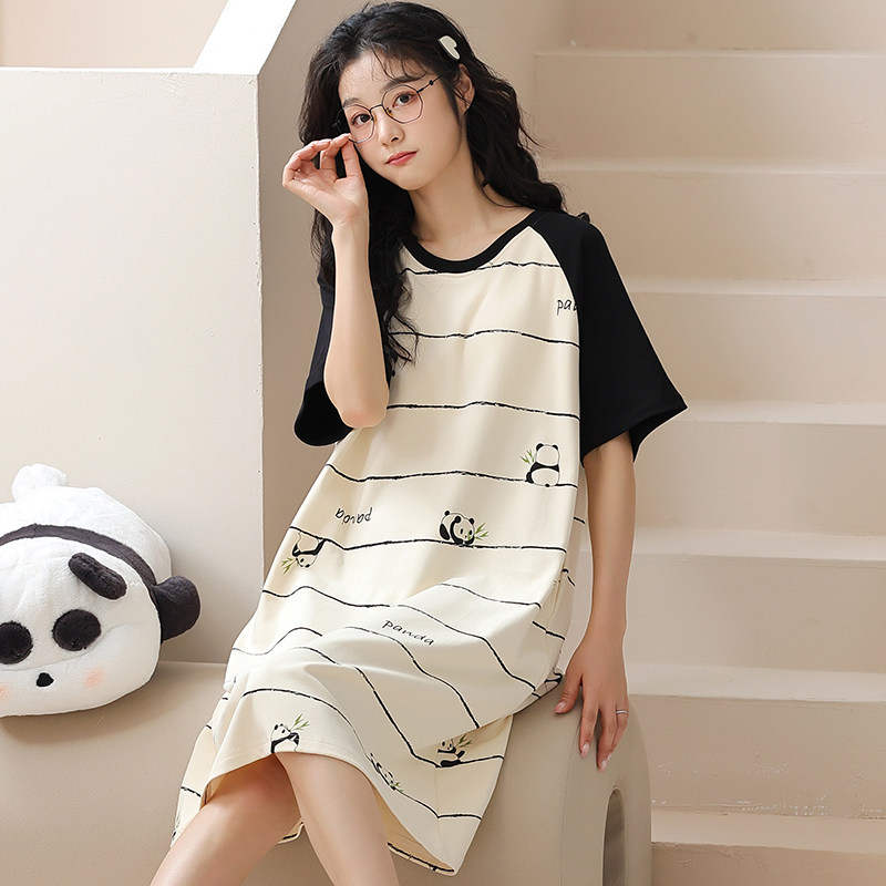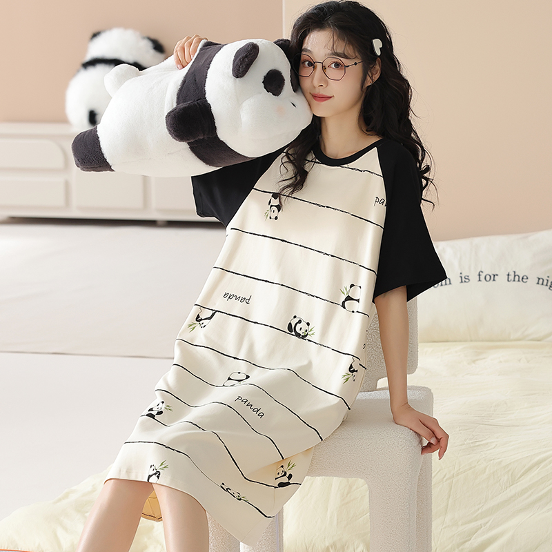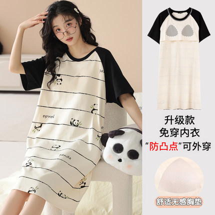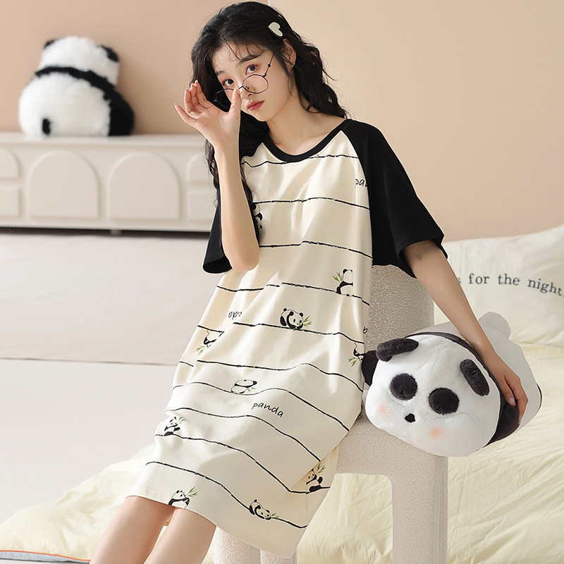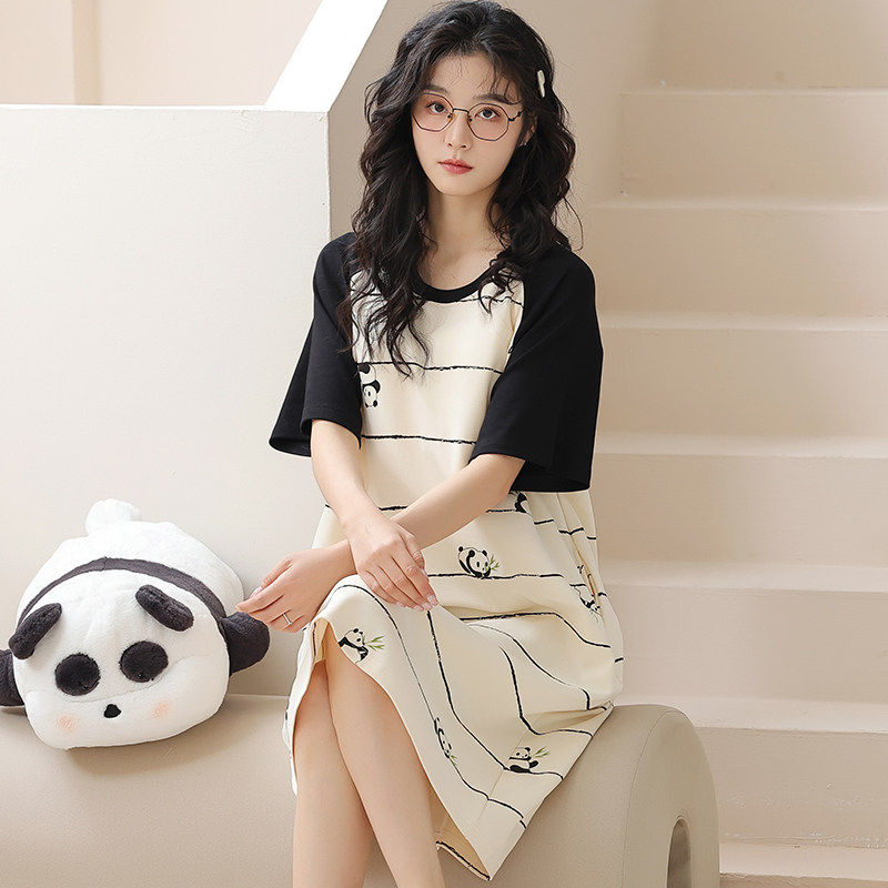 卡之恋睡衣女睡裙夏季带胸垫薄款纯棉短袖睡衣熊猫印花孕妇家居服