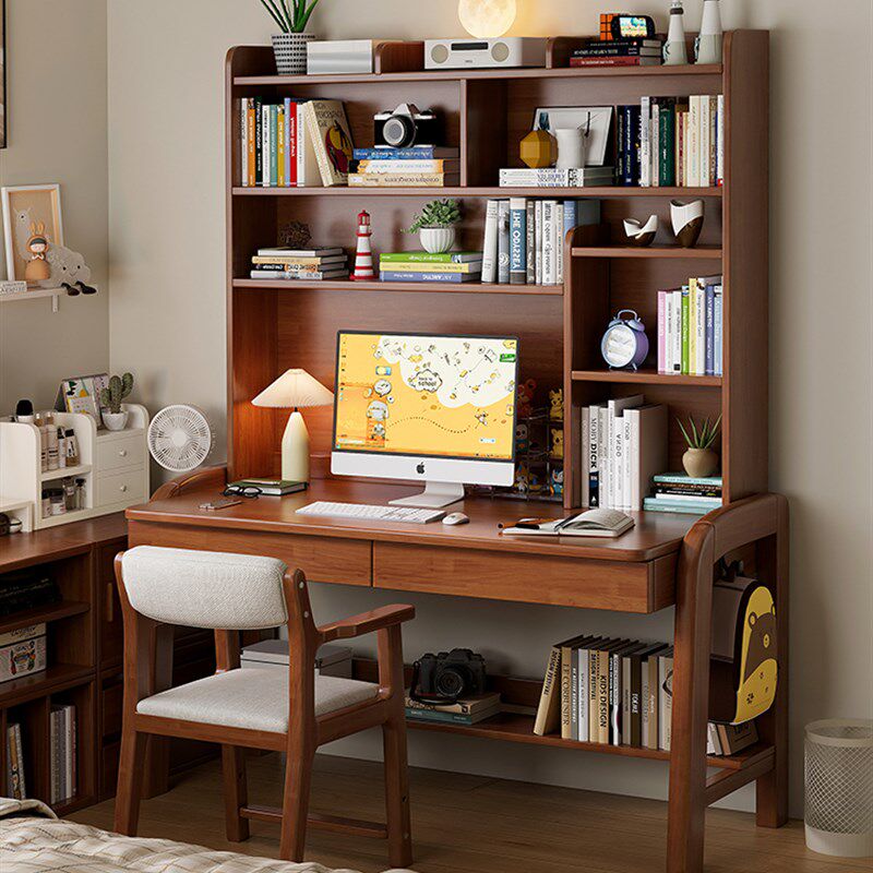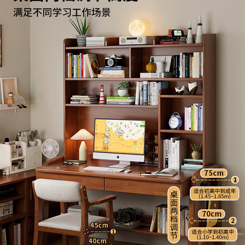 实木儿童学习桌卧室可升降学生写字桌书房写字台带书架简约电脑桌