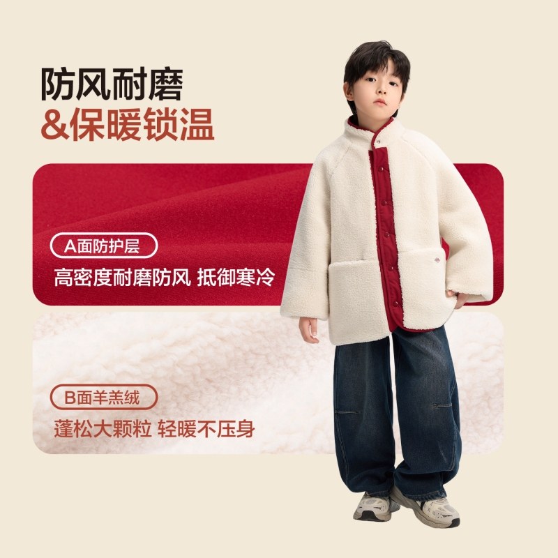 左西童装男童红色棉服外套2025新款儿童新年两穿羊羔绒冬季厚棉衣