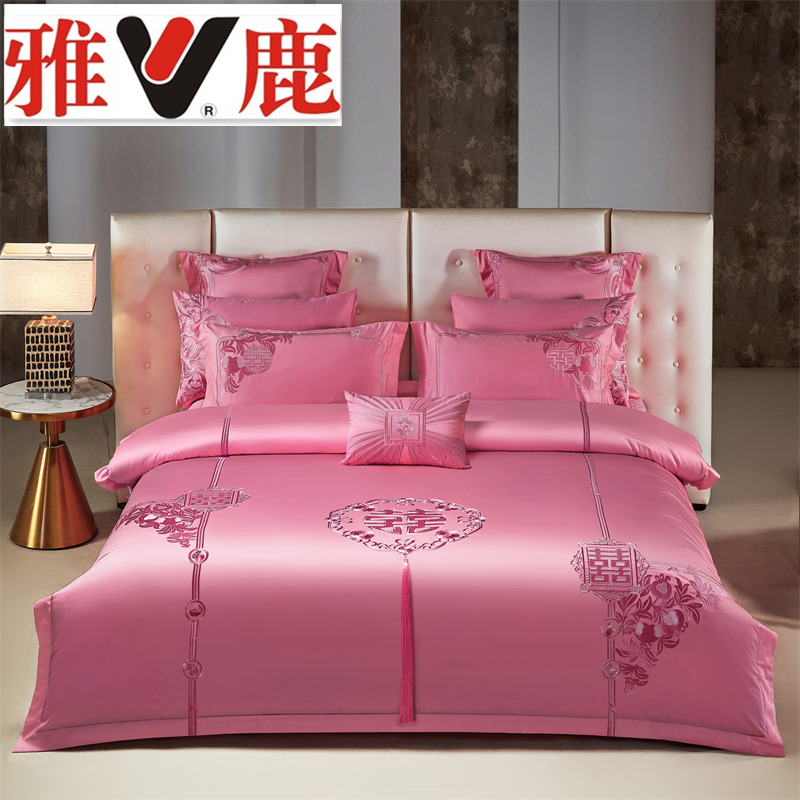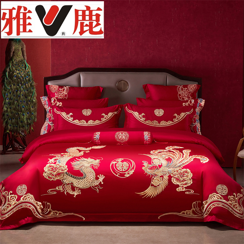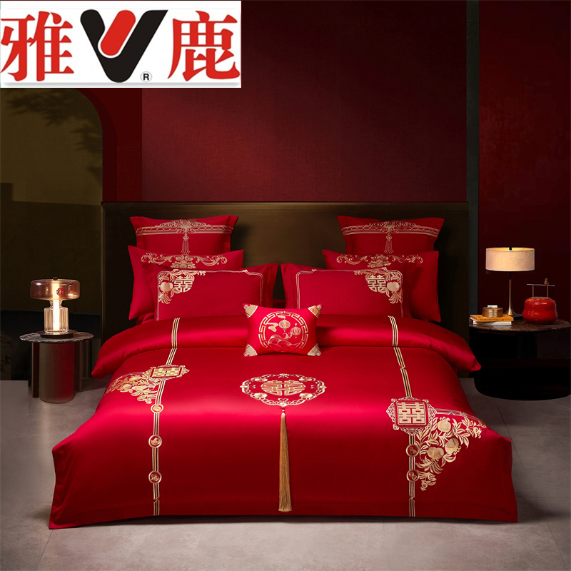 中式婚庆床上全棉四件套简约红色刺绣喜被套新婚床单纯棉结婚床品