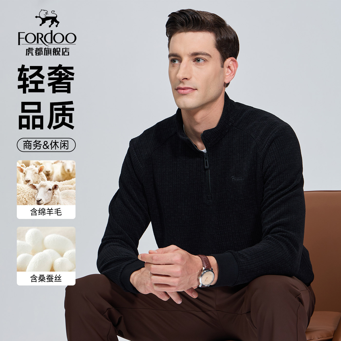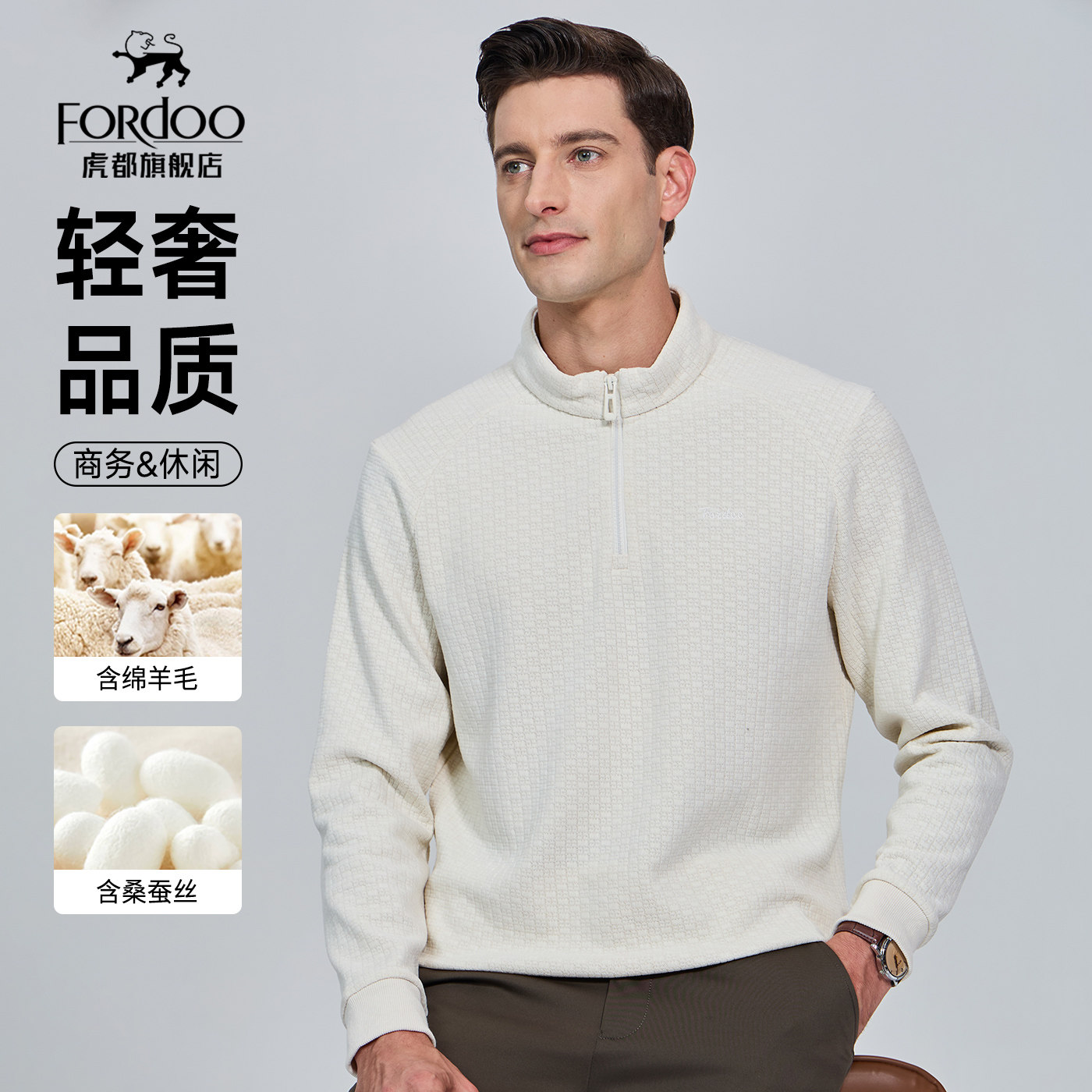 【桑蚕丝+绵羊毛】虎都秋春季男士半拉链长袖保暖卫衣休闲百搭T恤
