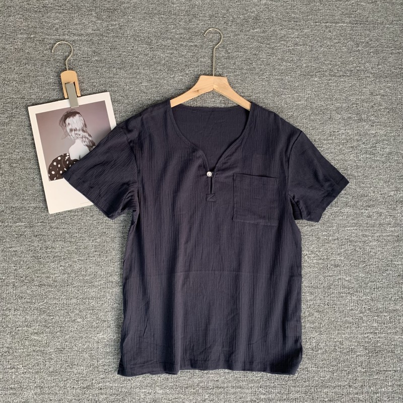 日单男装复古棉T恤男士夏季新款纯色百搭文艺V领口袋休闲短袖上衣