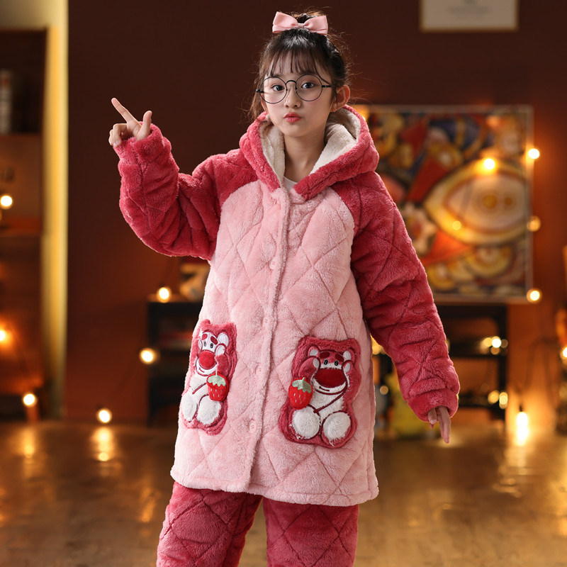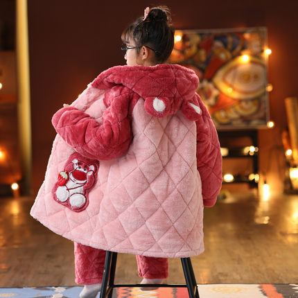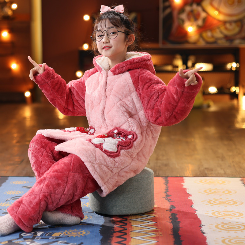 儿童冬季加长加厚款法兰绒睡衣套装珊瑚绒女童宝宝三层夹棉家居服
