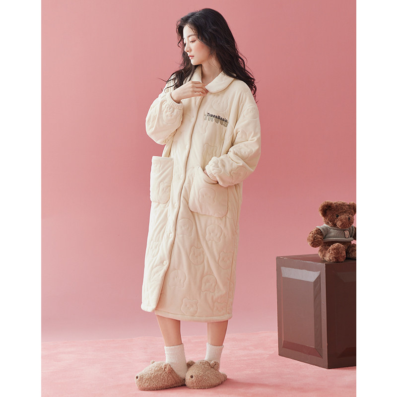 女士珊瑚绒睡袍冬季三层夹棉加绒加厚空气棉可爱休闲长款浴袍睡衣