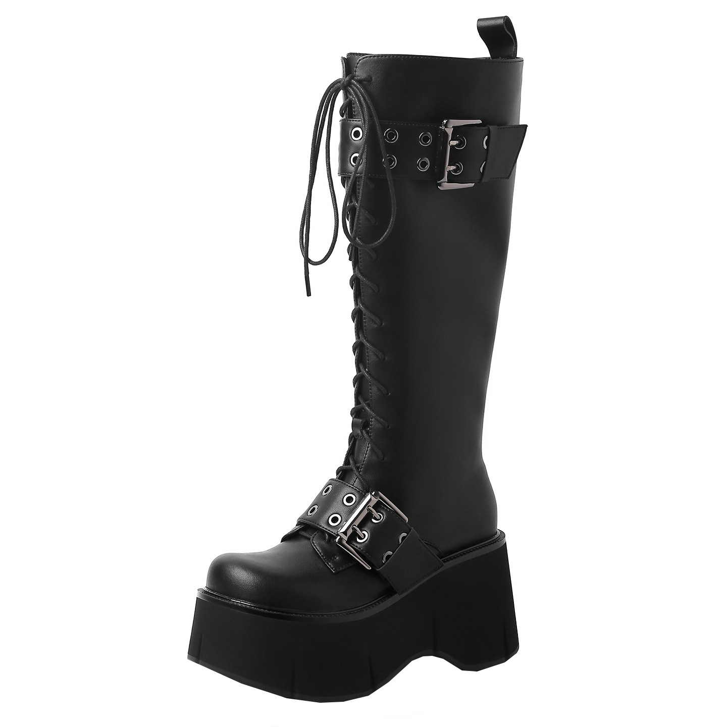 9cm黑色长筒靴女真皮松糕厚底小个子不过膝高筒靴系带圆头骑士靴