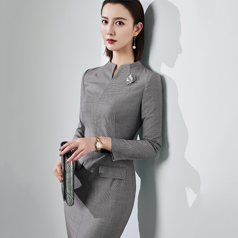 颈袖添香春季新款女装修身收腰包臀羊毛裙职业连衣裙女中长款