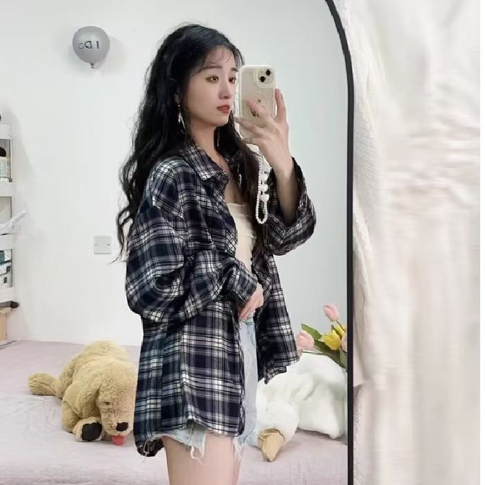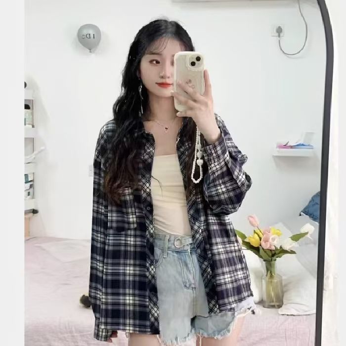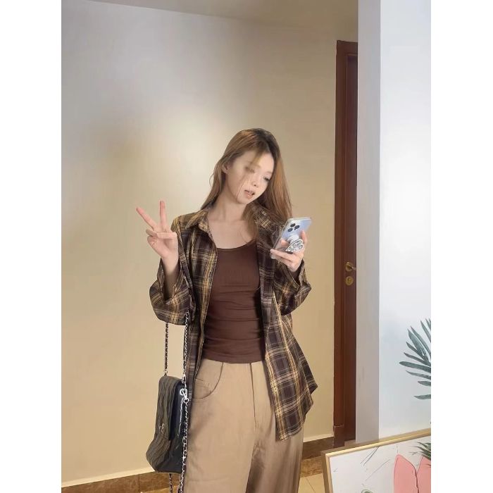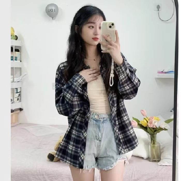 韩式覆古长袖格子衬衫外