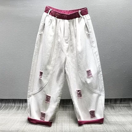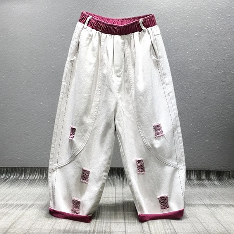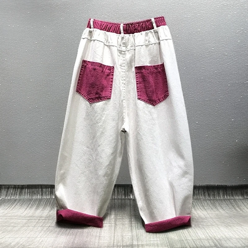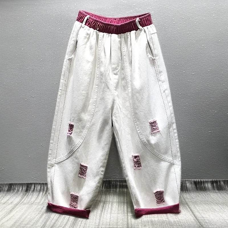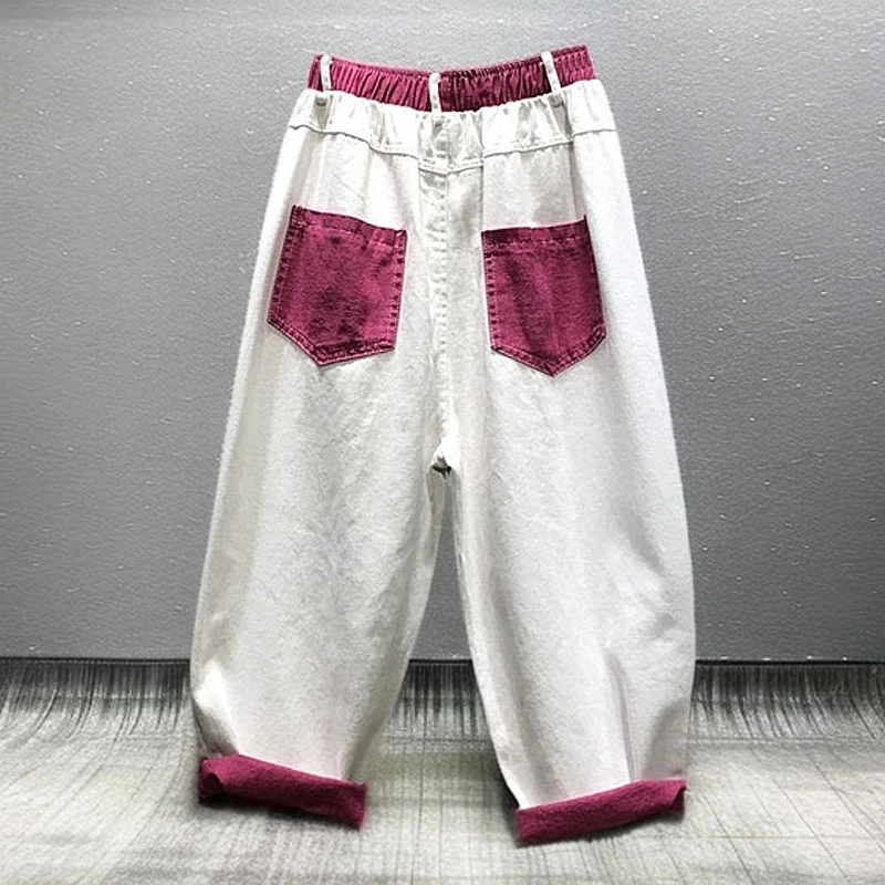 松紧腰九分牛仔裤口袋阔腿老爹裤