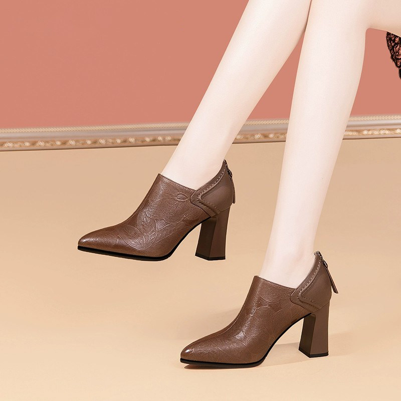 法式真皮高跟鞋女2025春季新款深口小皮鞋粗跟尖头时尚百搭女鞋子
