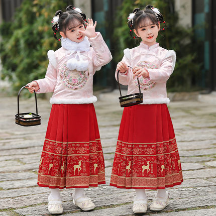 汉服女童儿童加厚改良马面裙秋冬季拜年服唐装古风加绒演出表演服