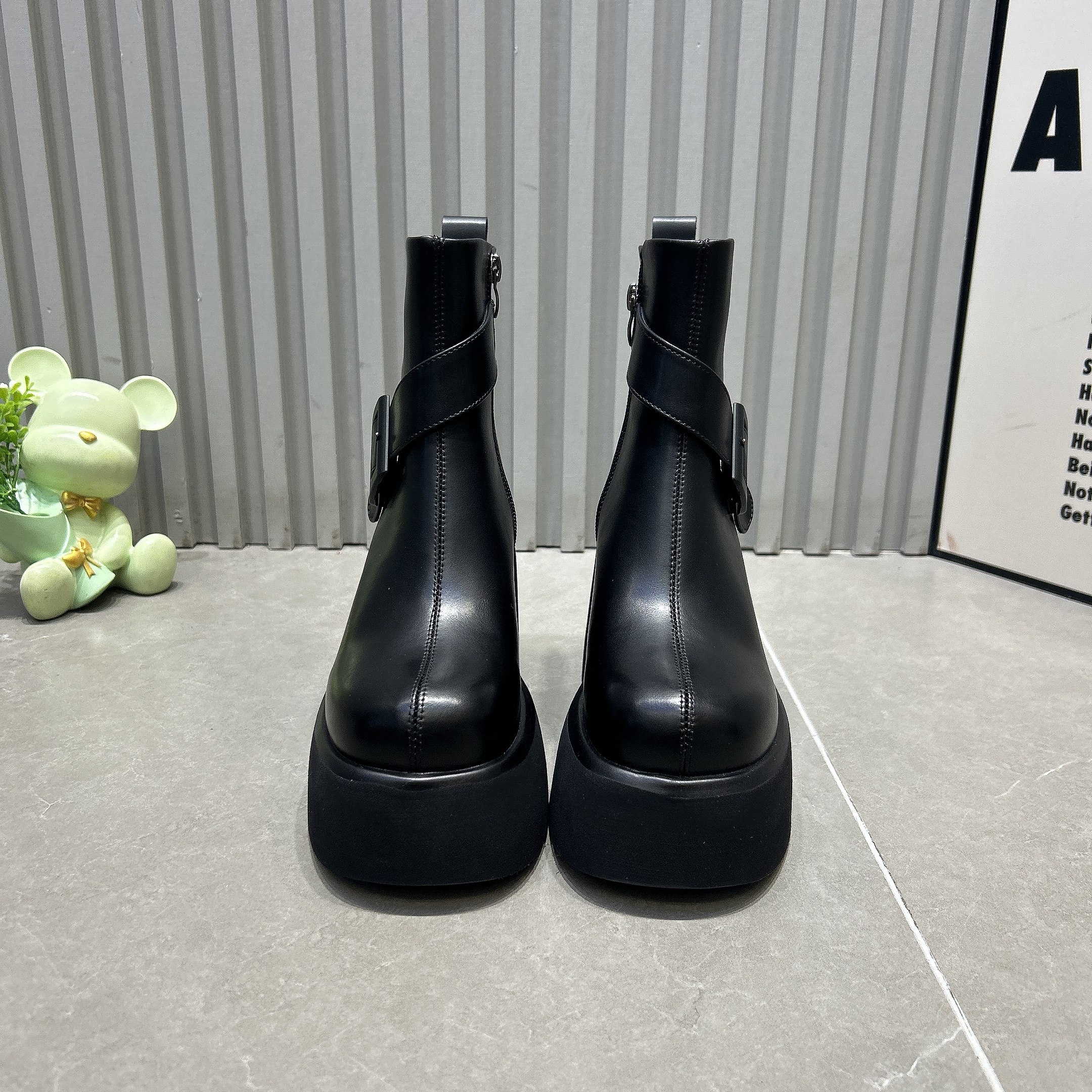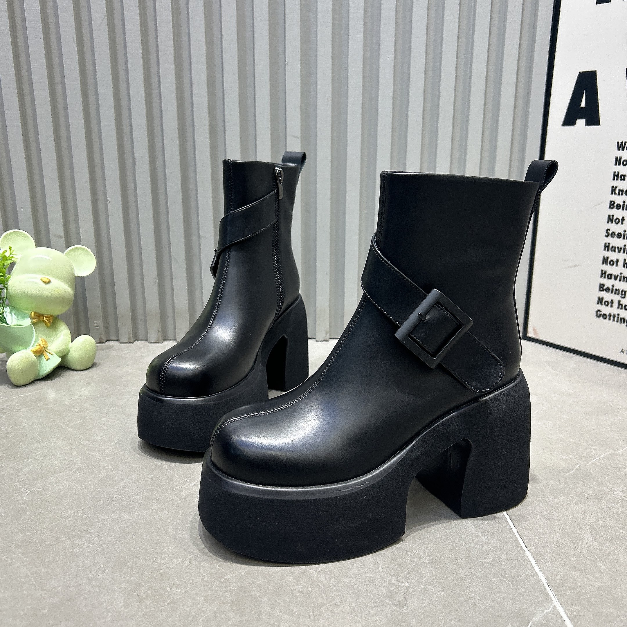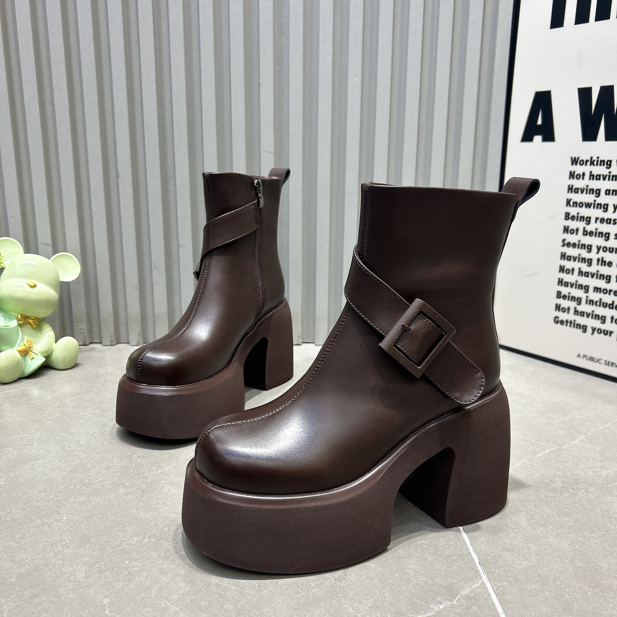 气质女靴秋冬加绒棉鞋新款10CM粗跟厚底短靴防水台真皮高跟马丁靴