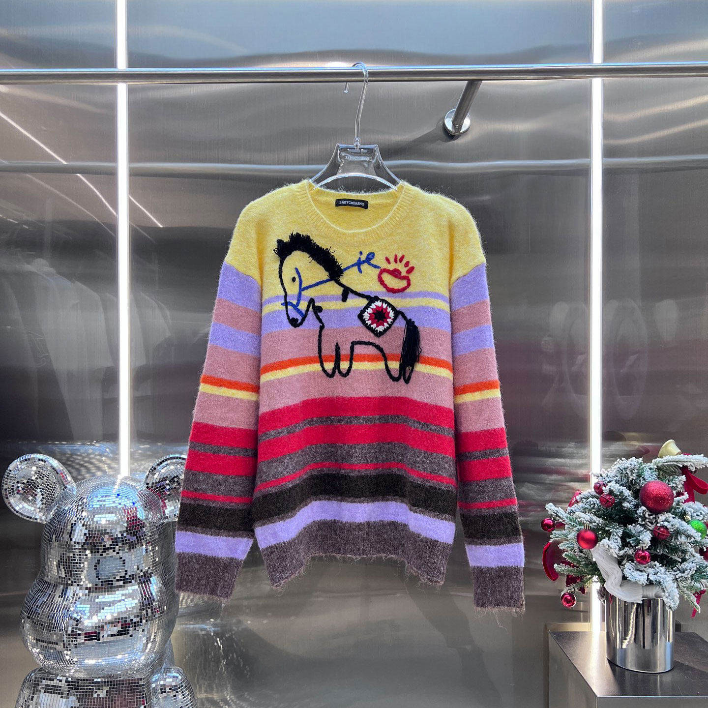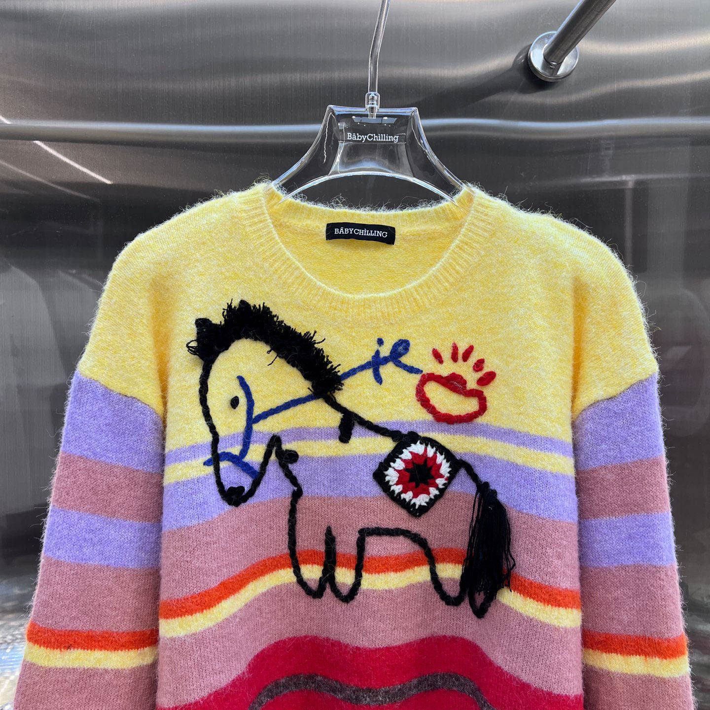 BBLY欧洲站小众英伦风减龄百搭宽松彩虹针织衫小马刺绣套头毛衣女
