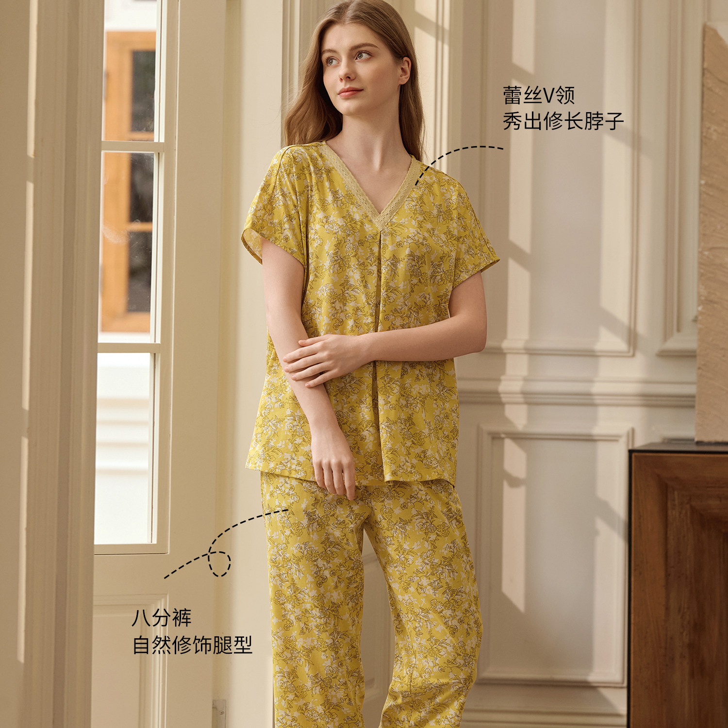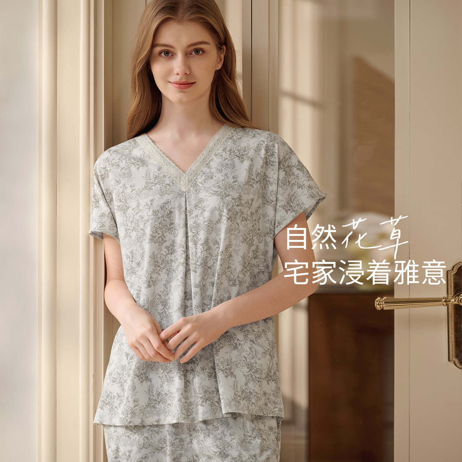 秋鹿睡衣纯棉女士蕾丝V领印花绝美短袖八分裤2026春夏新款家居服
