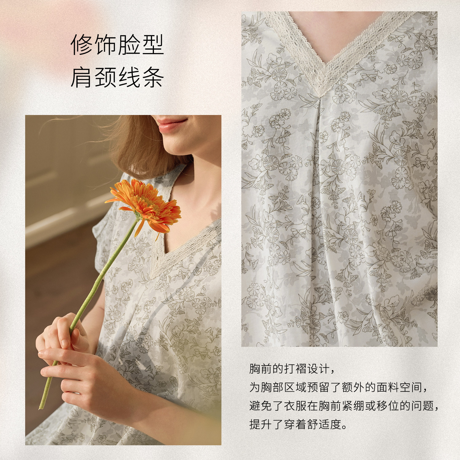 秋鹿纯棉睡衣女士蕾丝V领短袖
