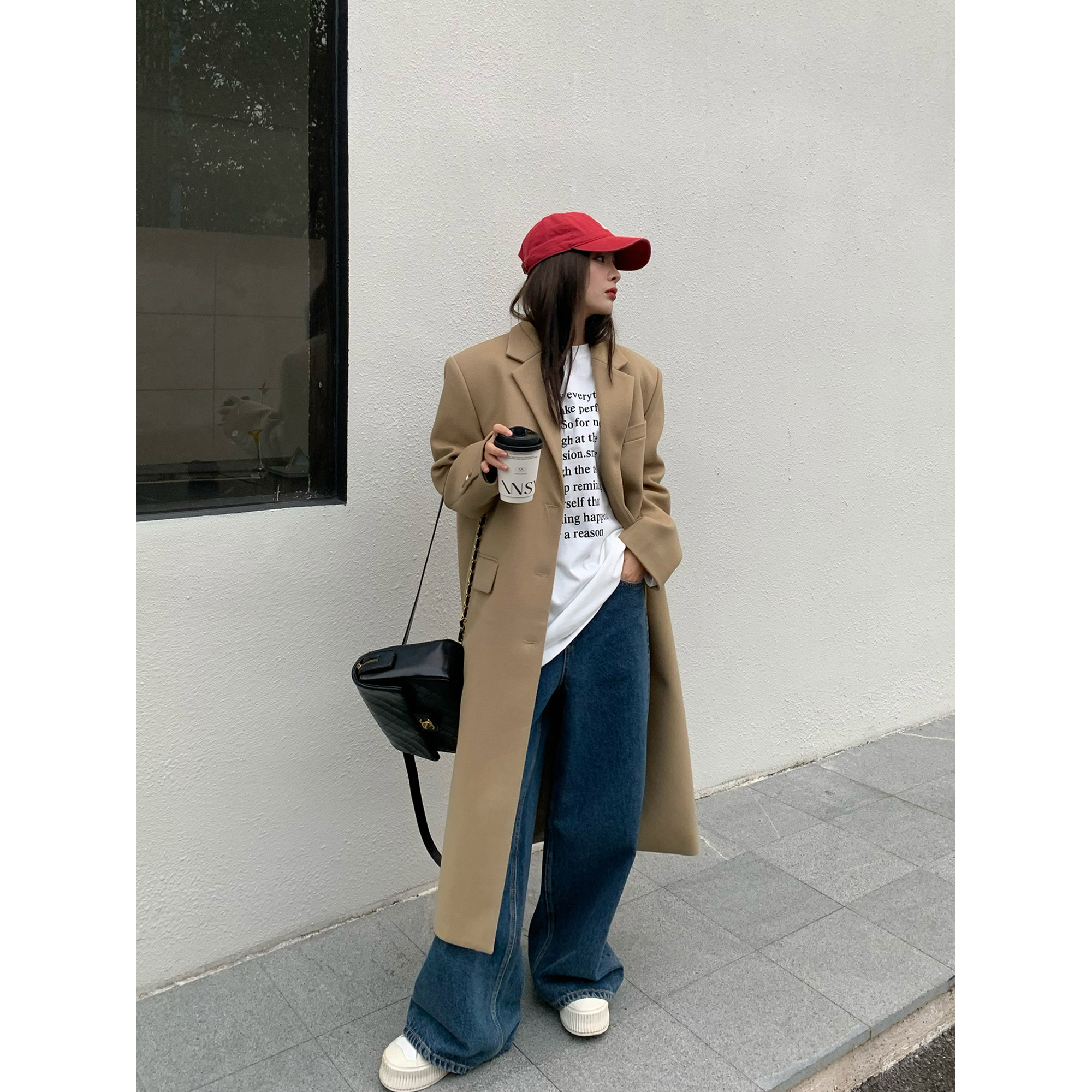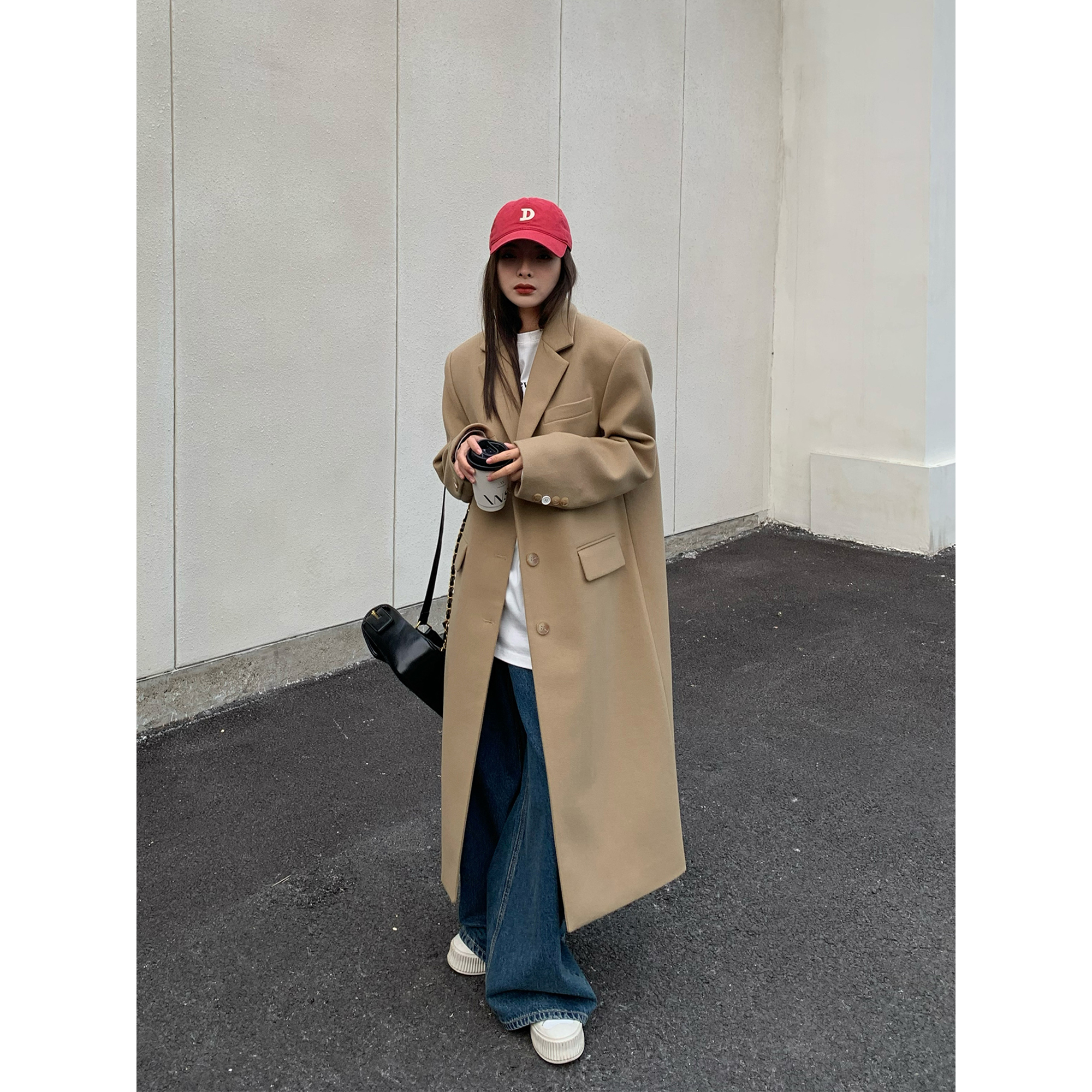 辰米范 驼色中长款毛呢大衣女秋冬新款气质宽松加厚呢子西装外套