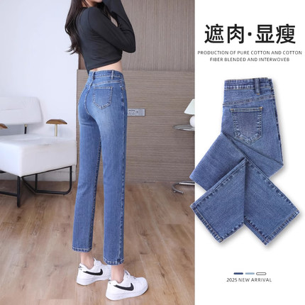 直筒牛仔裤女秋冬2025年新款高腰显瘦八九分小个子加绒烟管裤子