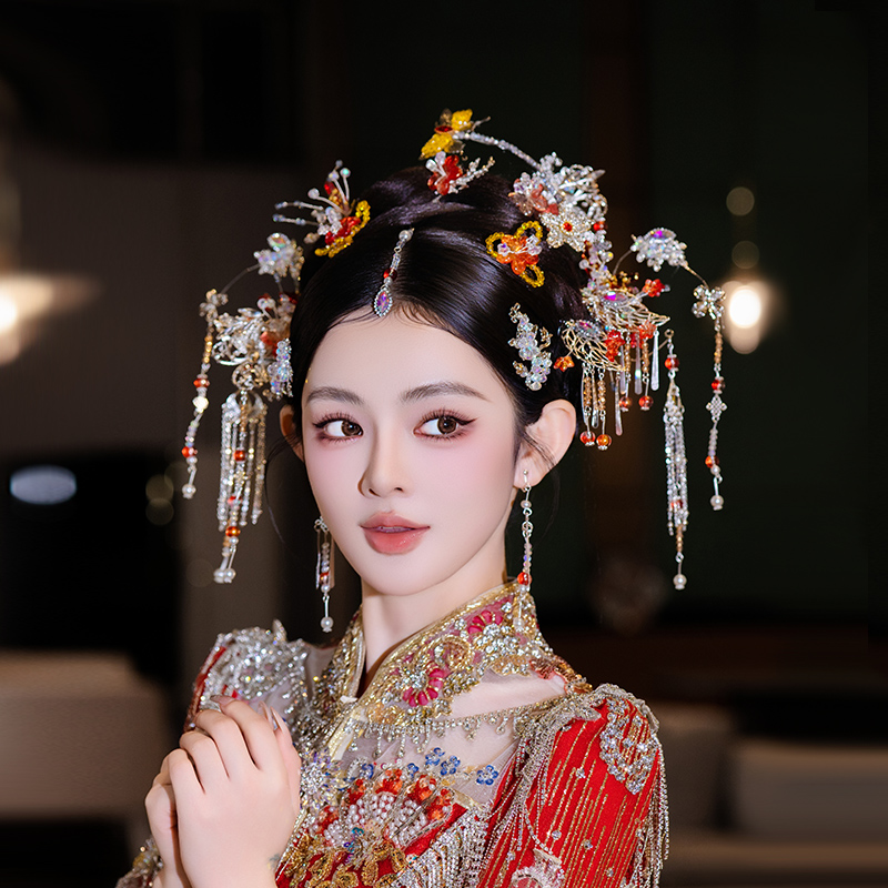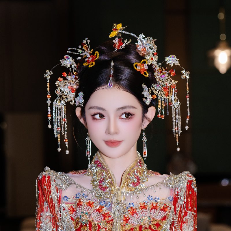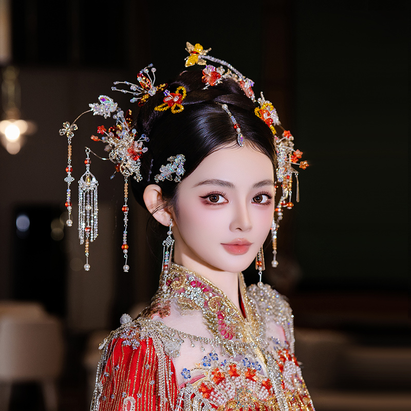 新娘头饰减龄秀禾服发簪流苏古风汉服复古手工银橘色甜美结婚头饰