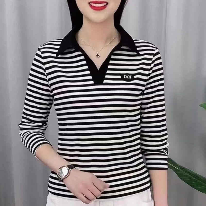 长袖T恤女2026秋冬季条纹宽松大码拼接翻领POLO衫中年妈妈装上衣