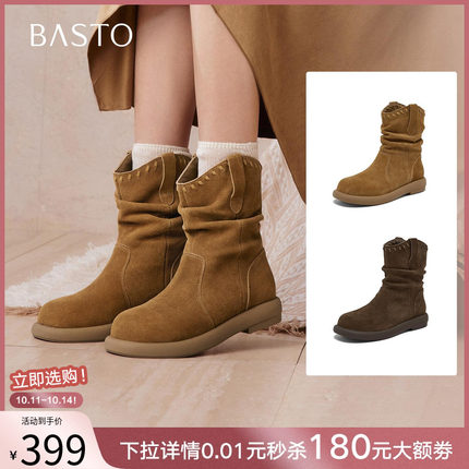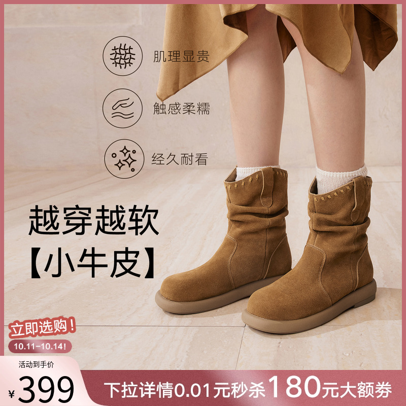 百思图2025冬季商场新款美拉德西部堆堆靴女显瘦真皮短靴D3780DZ5