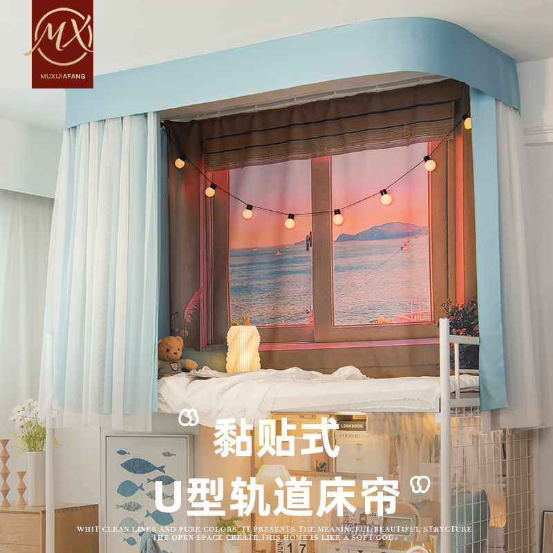 宿舍到顶双滑轨遮光床帘上铺大学寝室免打孔自粘贴式u型轨道蚊帐