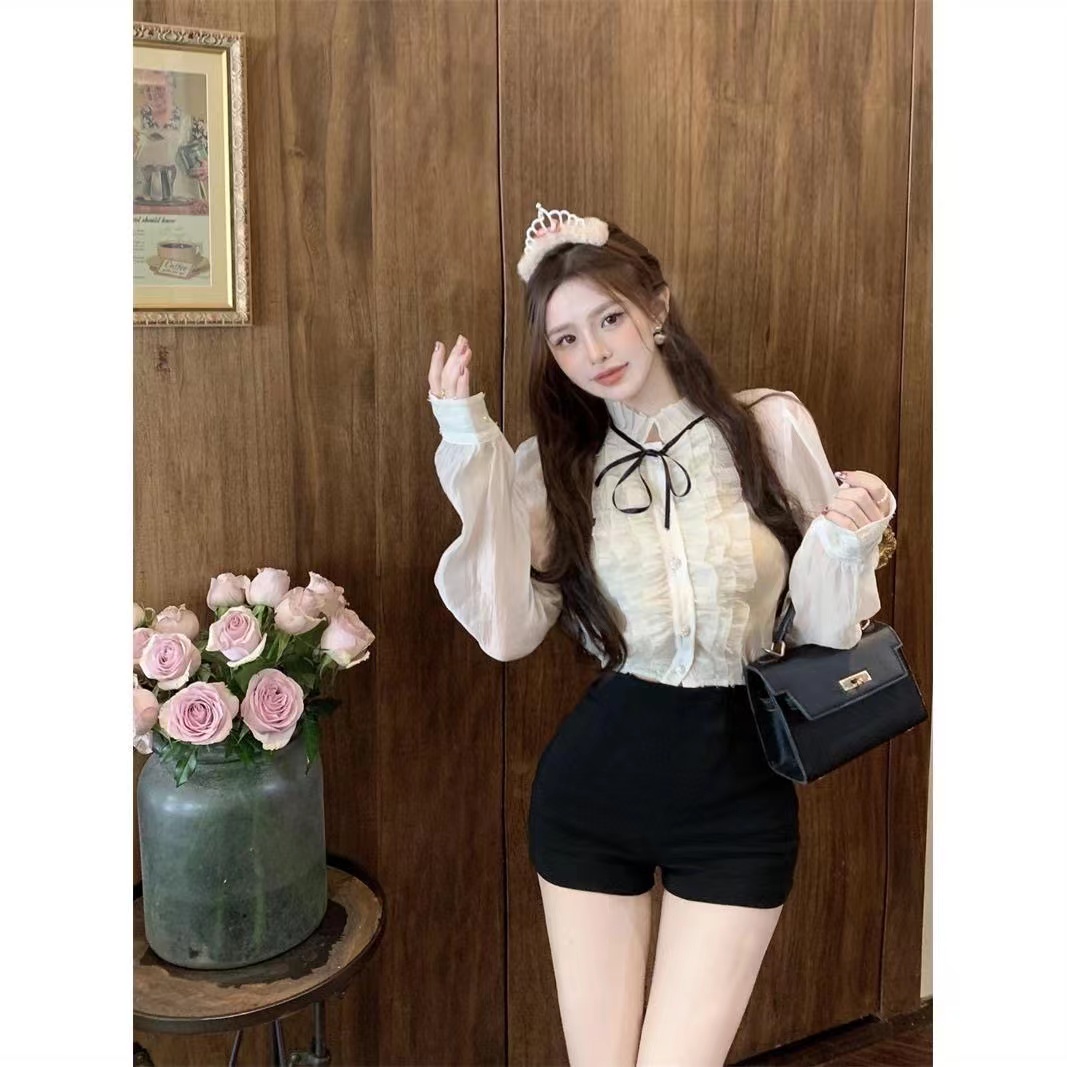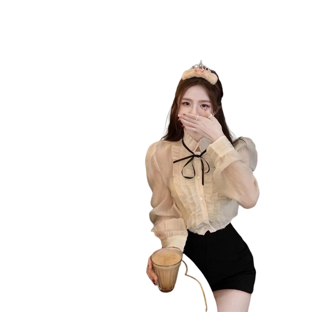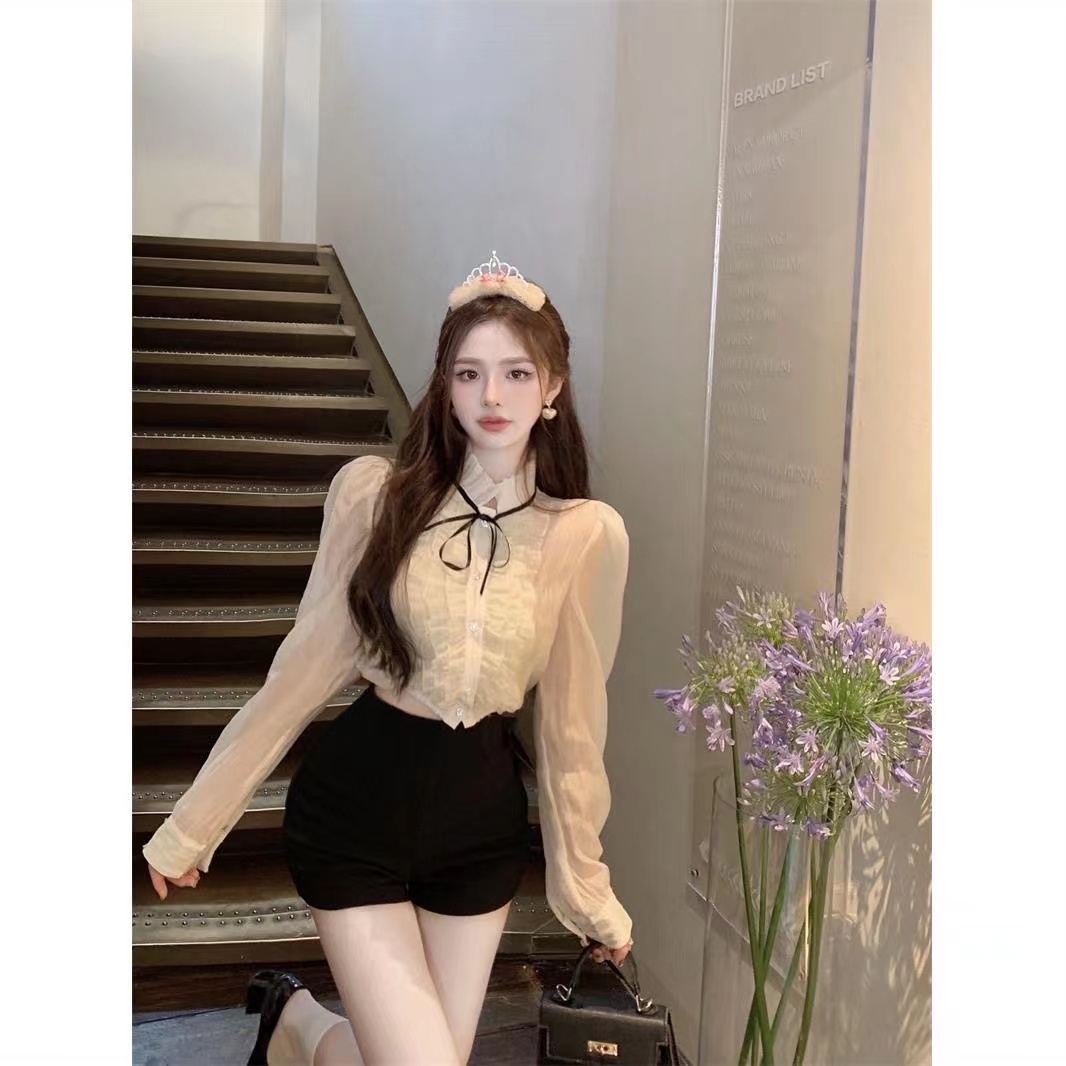 甜美木耳边长袖衬衫女装夏季法式宽松短款防晒衬衣别致泡泡袖上衣