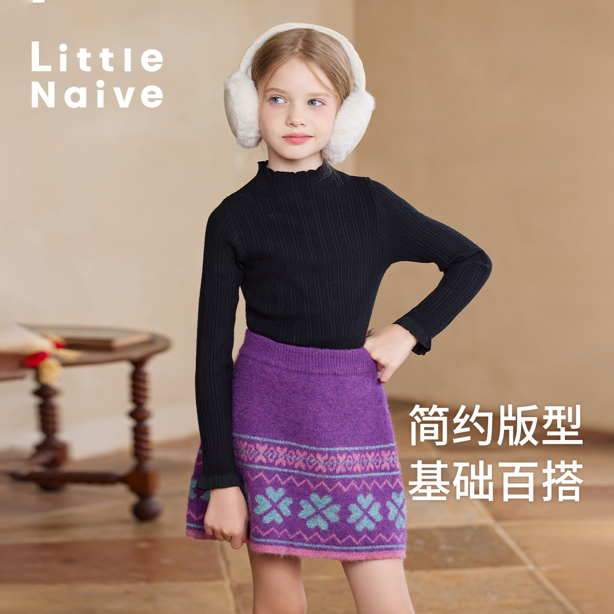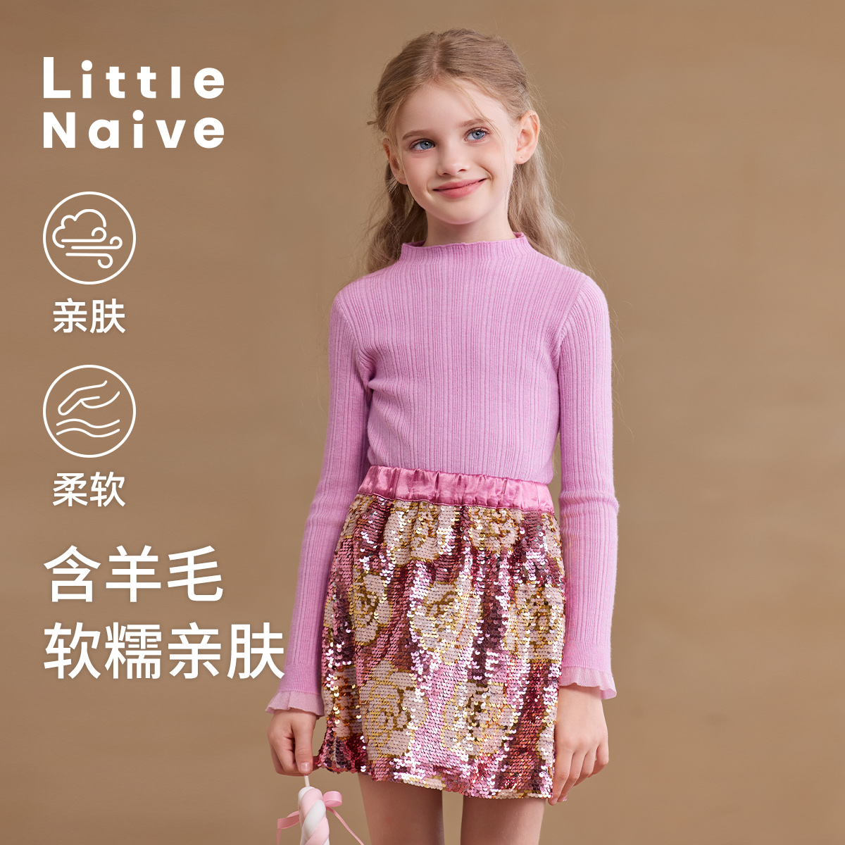 Little Naive儿童修身打底衫秋冬新款木耳边半高领毛衣女童针织衫