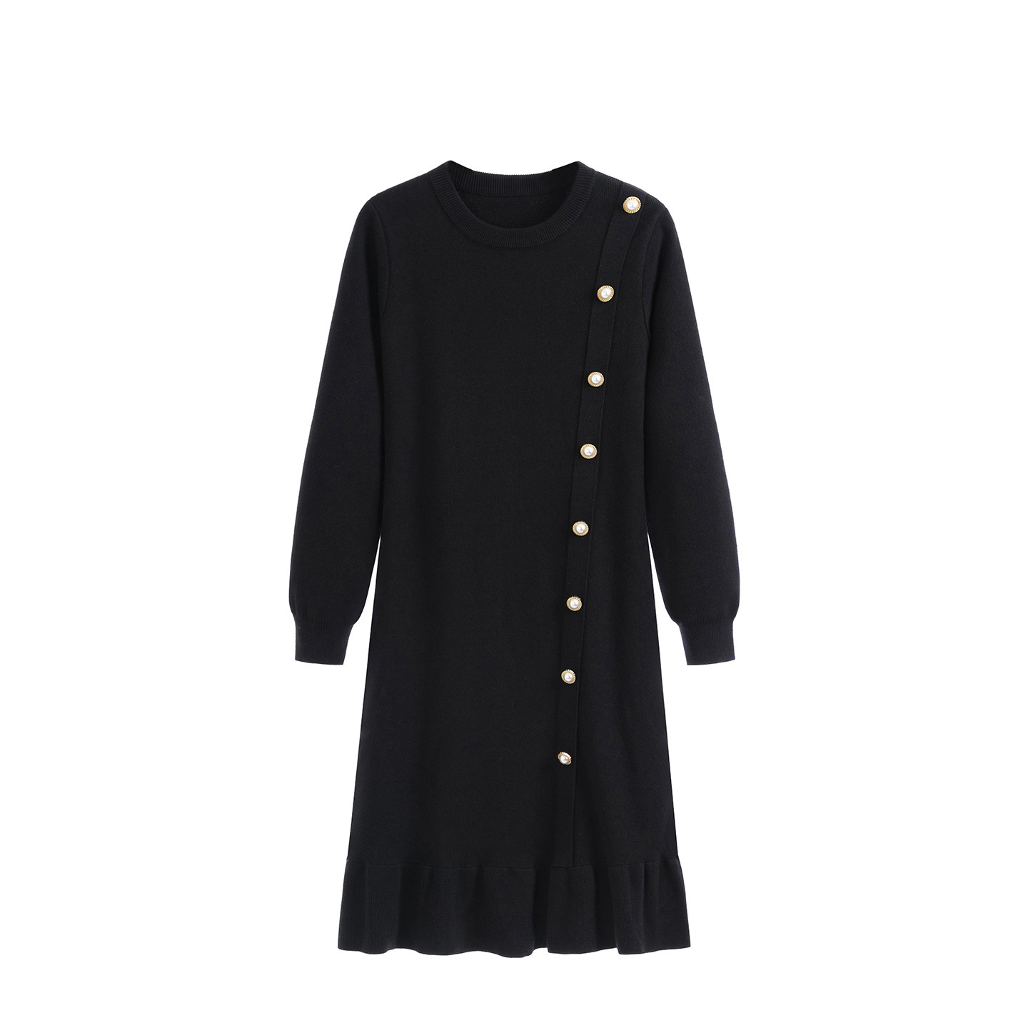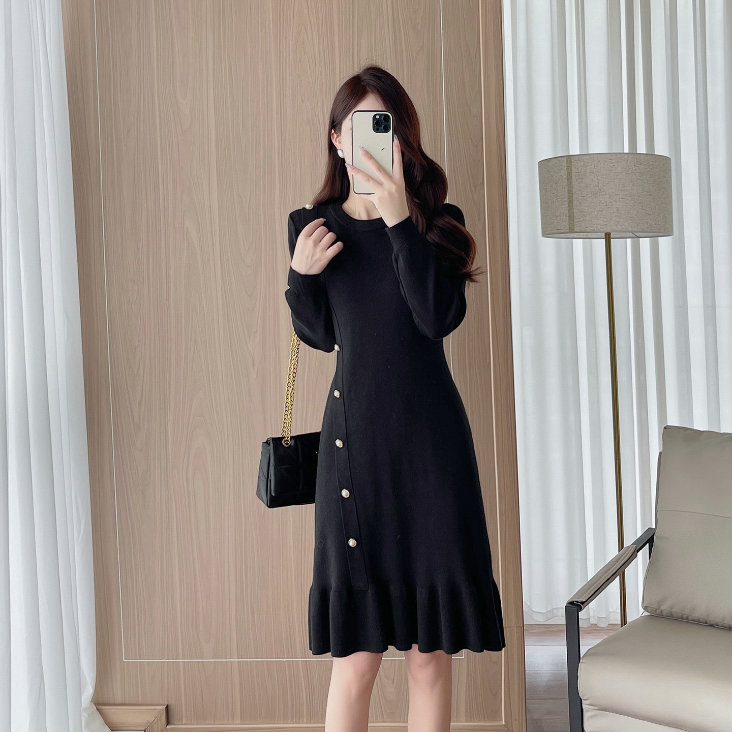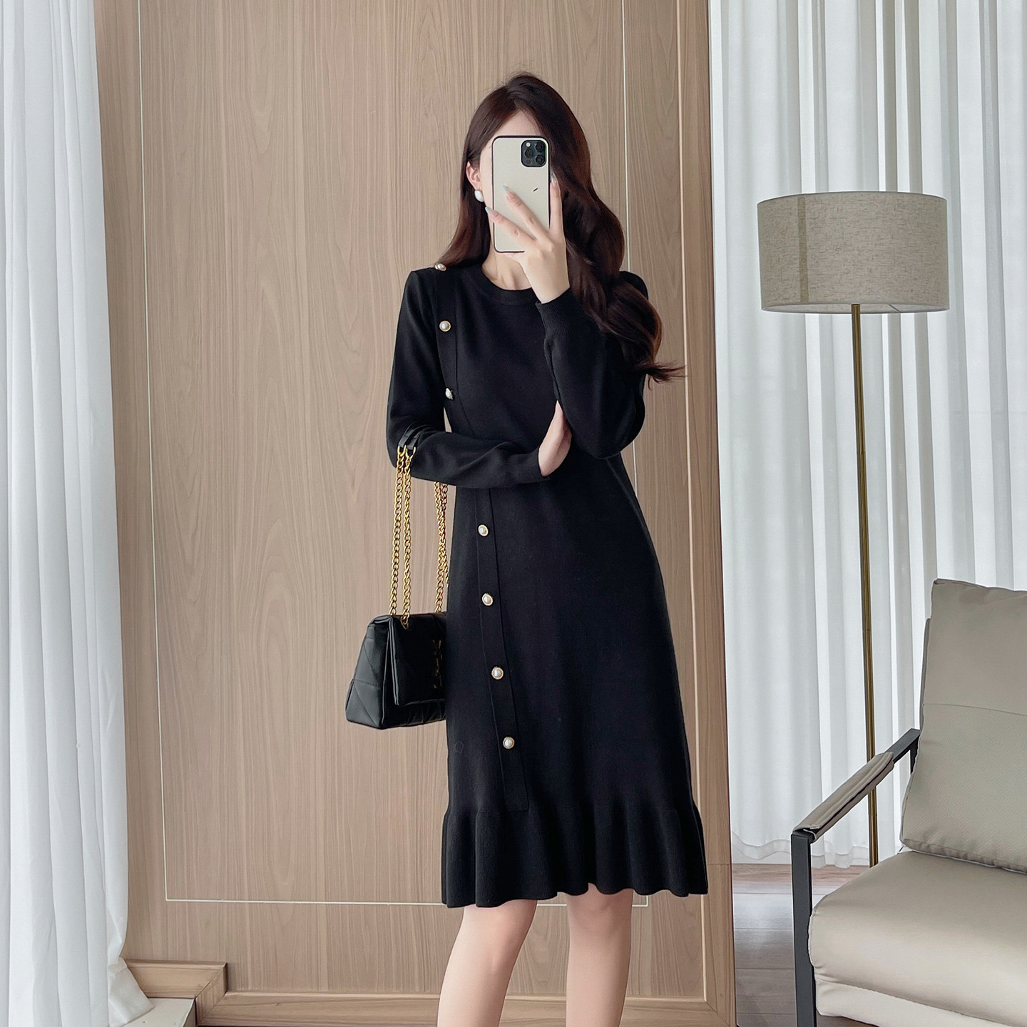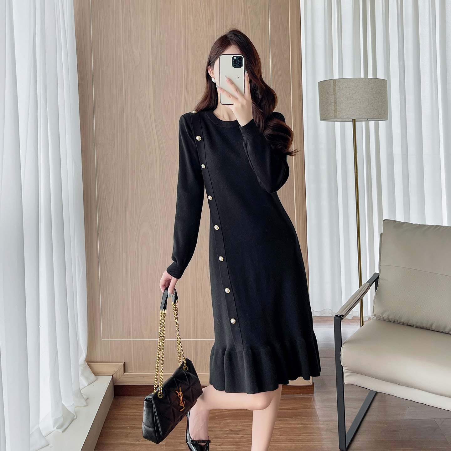 感黑色毛衣鱼尾裙女秋冬季小香风长袖内搭打底针织连衣裙女潮