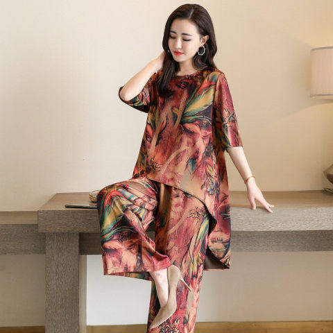 2023妈妈套装夏装新款短袖上衣女士大码阔腿裤复古印花显瘦两件套