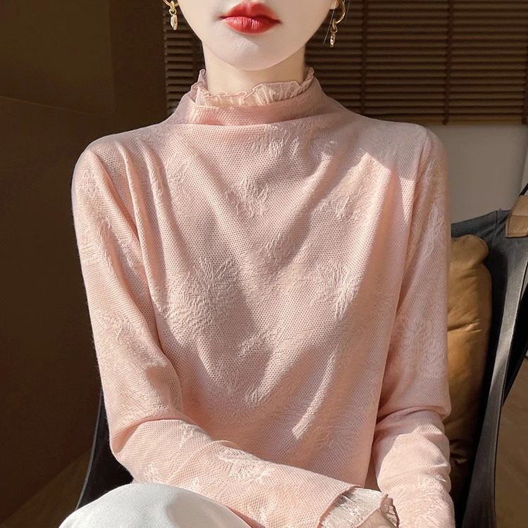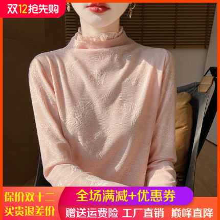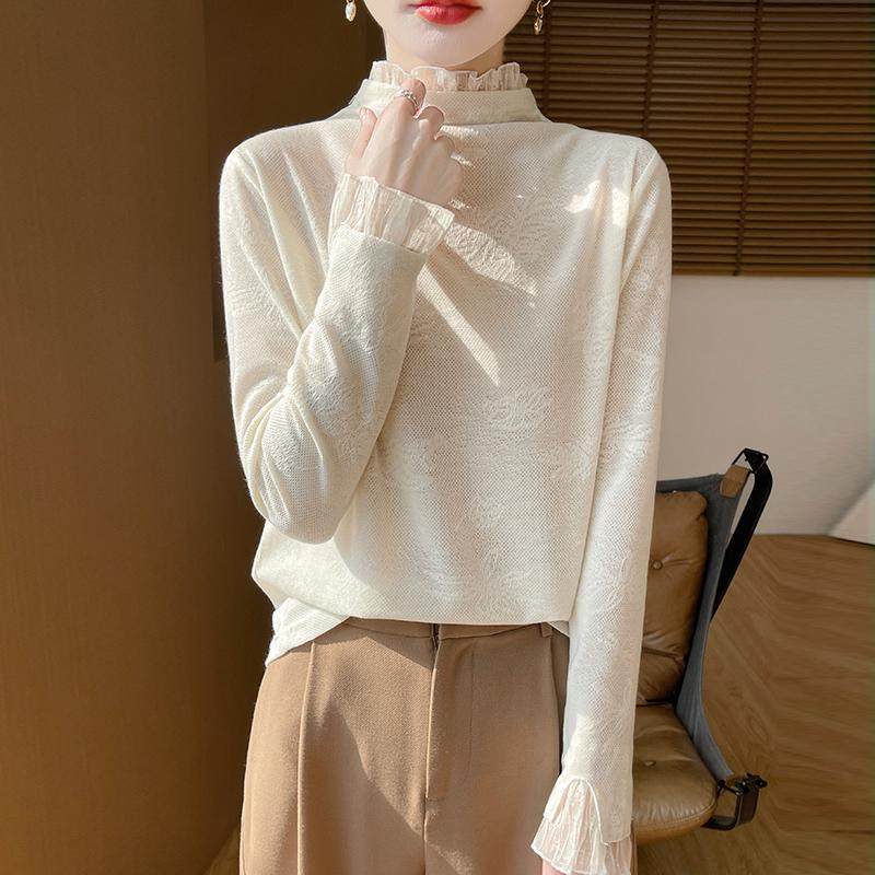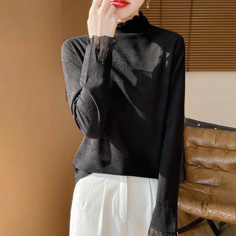 半高领蕾丝提花精纺羊毛衫女春秋薄款针织毛衣宽松气质打底衫上衣