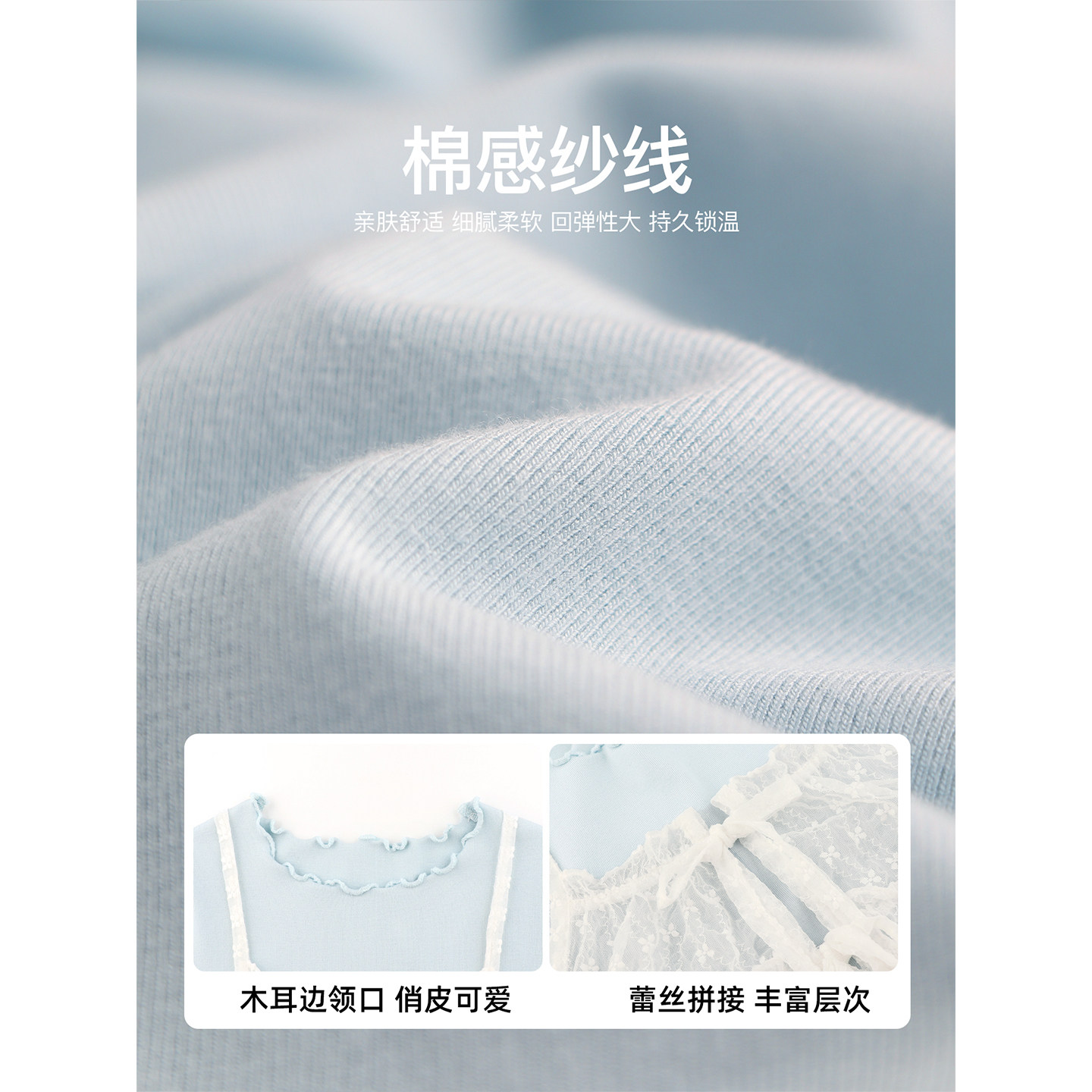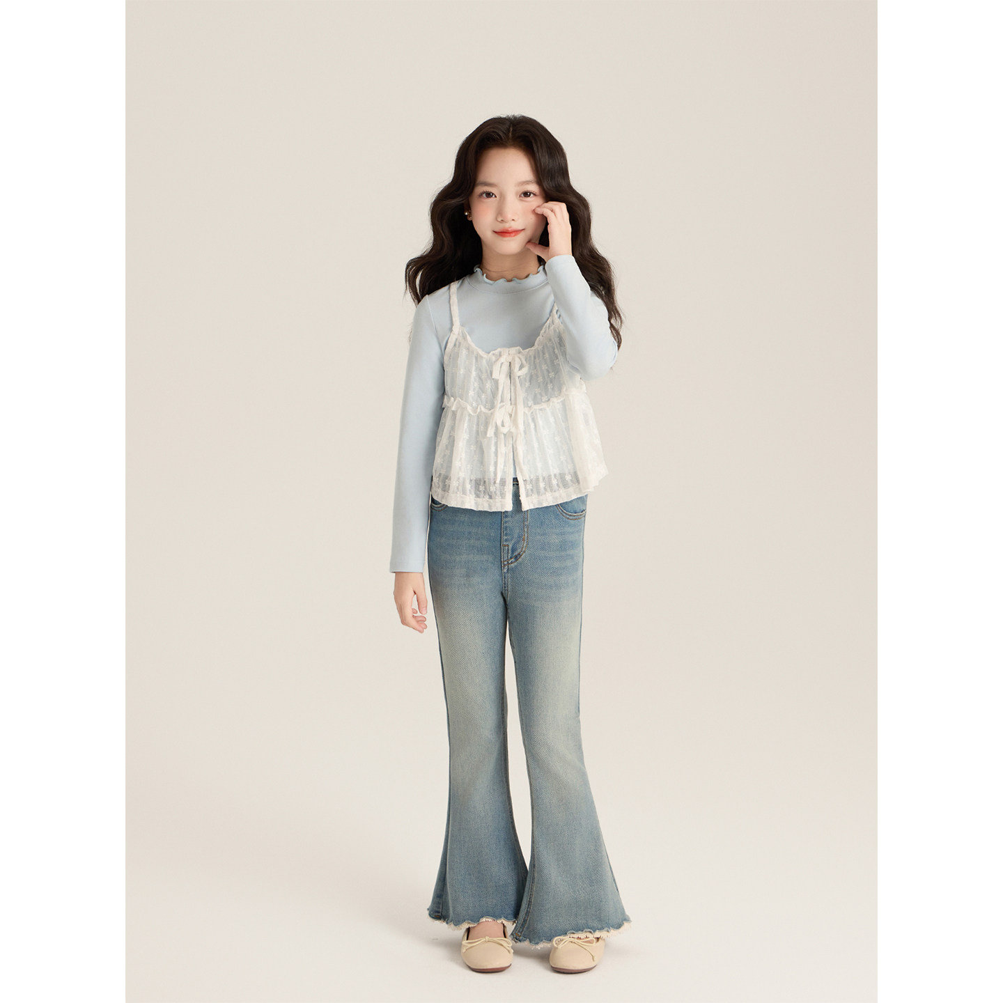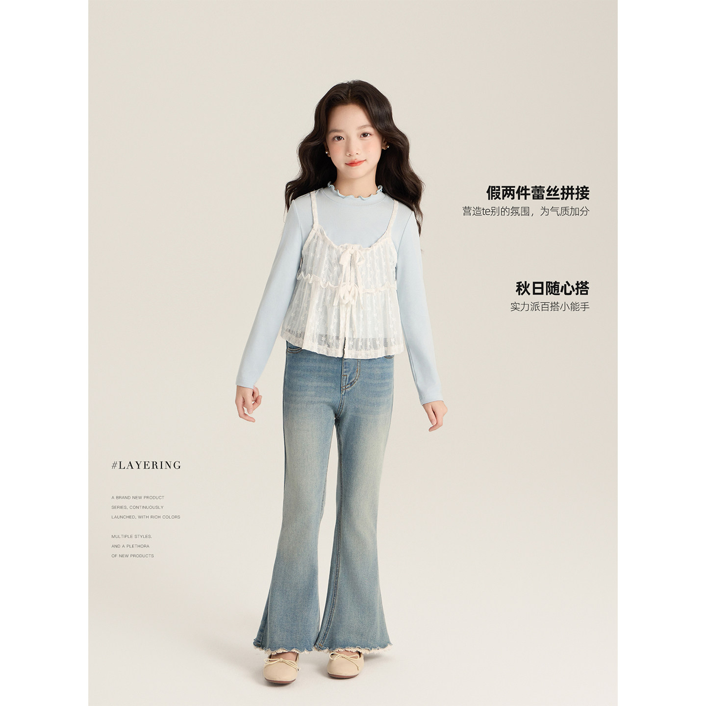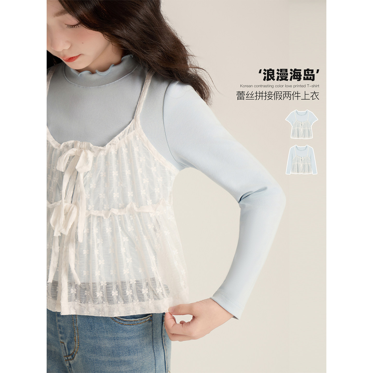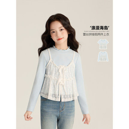 Amybaby女童上衣秋季2025新款秋日海岛韩版甜美蕾丝吊带假两件T
