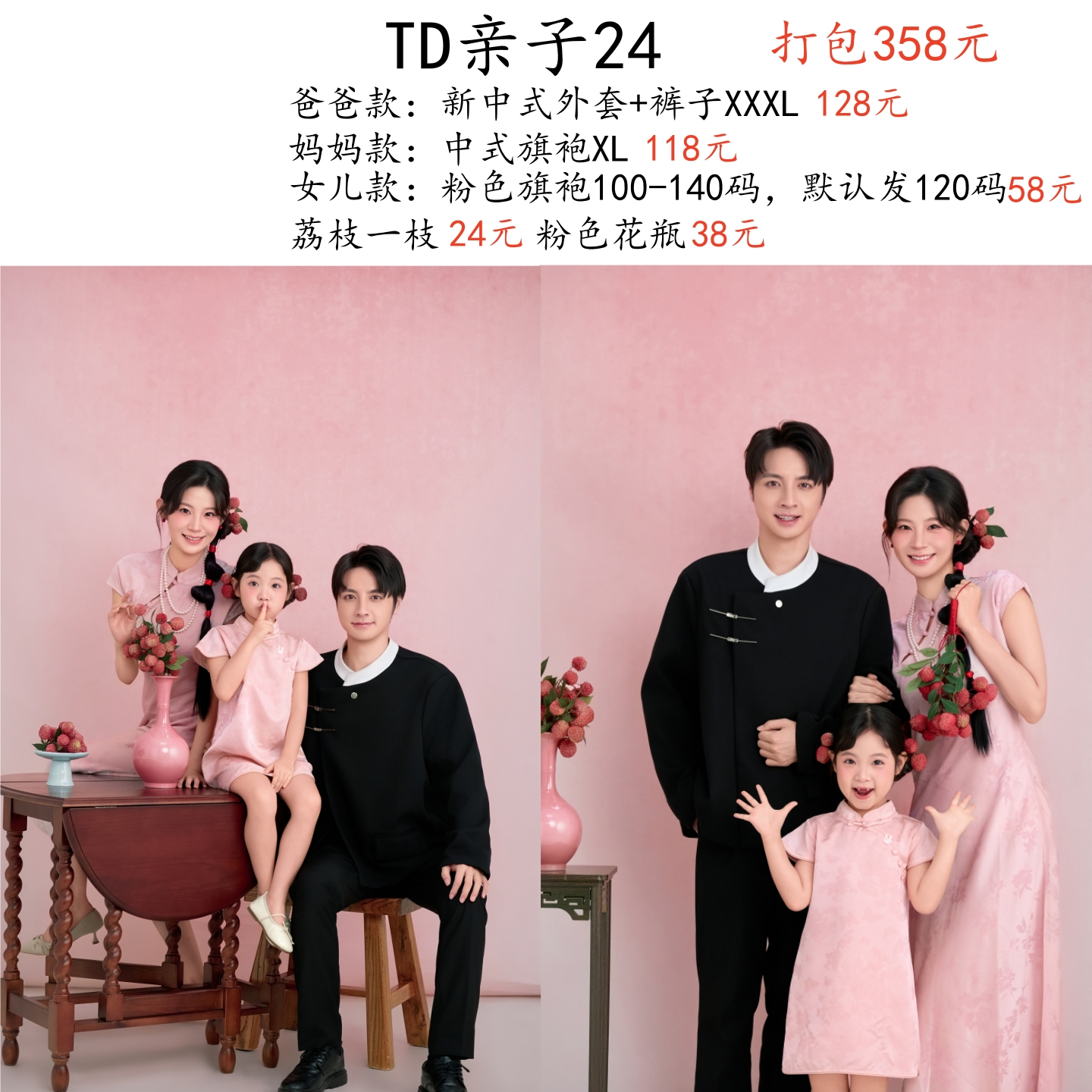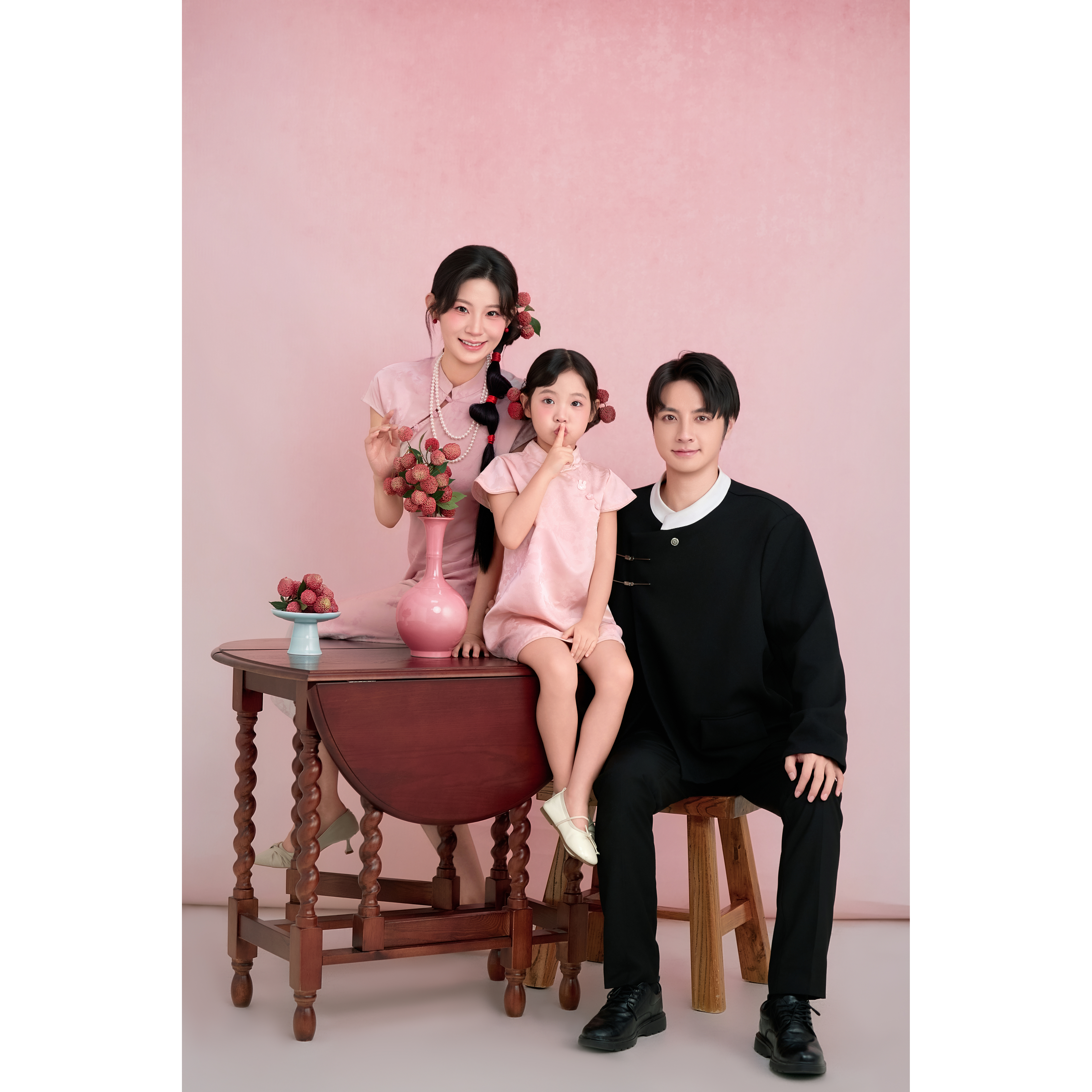 亲子装一家三口荔枝风影楼拍照主题网红款全家福家庭装母女旗袍服