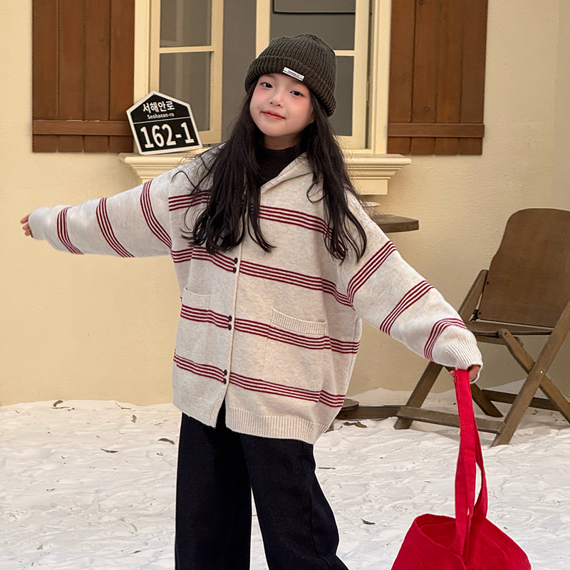 女童毛衣2025新款条纹开衫外套宽松慵懒风针织外套休闲百搭上衣