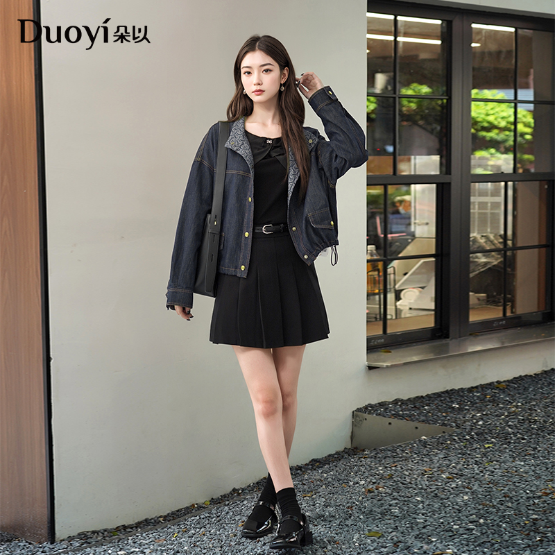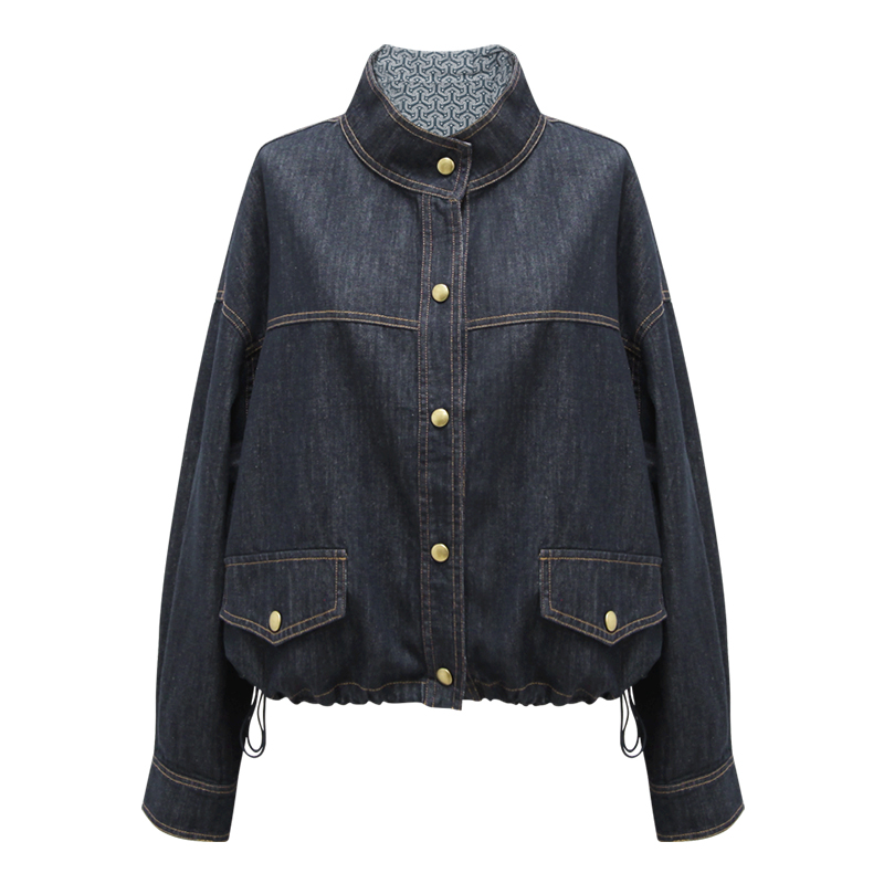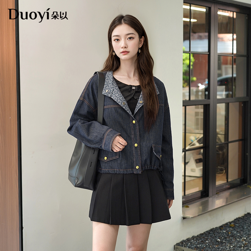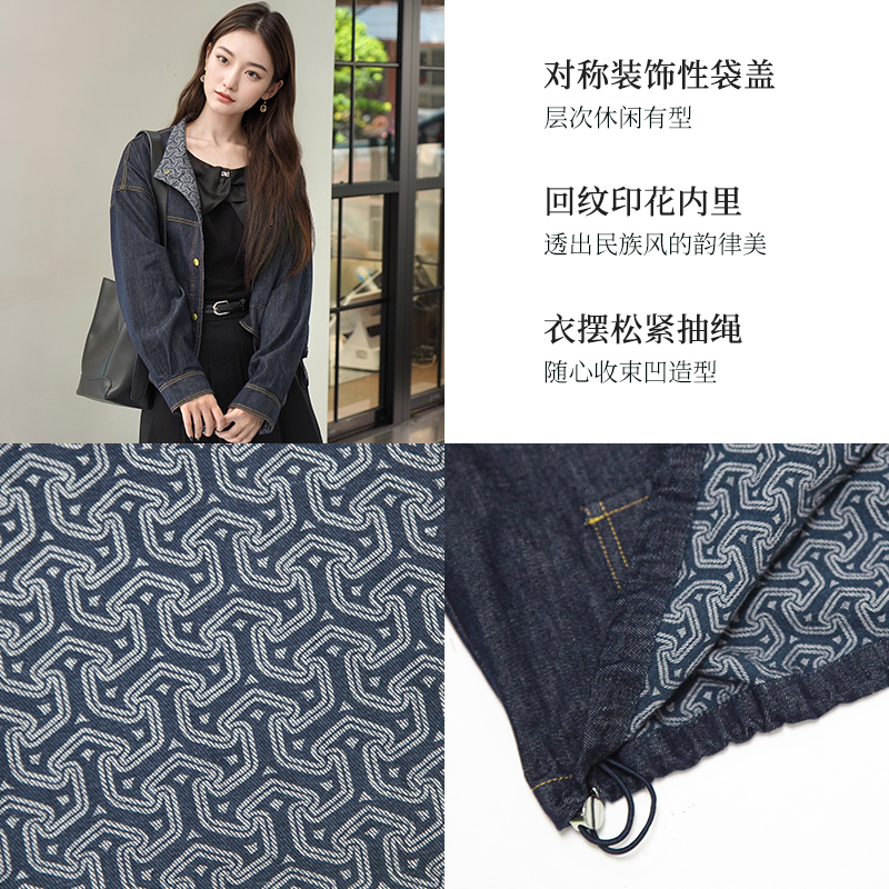 朵以2025冬季新款复古时尚民族风撞色印花抽绳短款立领牛仔外套女