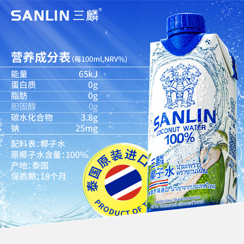 三麟100%椰子水富含天然电解质泰国进口NFC椰青果汁330ml12/24瓶